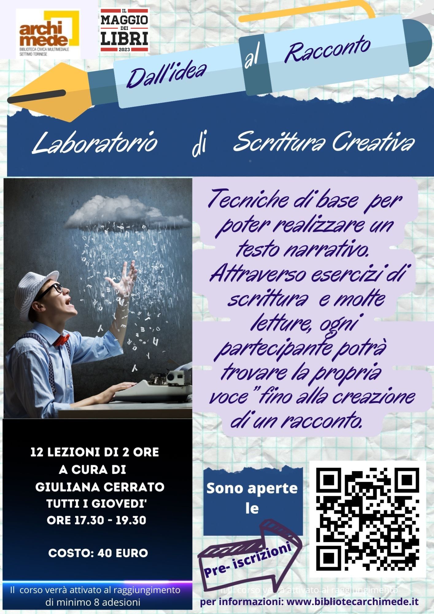 Ti piace scrivere? Hai nel cassetto un manoscritto o una poesia già scritti, ma non ti convincono? Se hai tante idee che vorresti mettere sulla carta, ma difficoltà a disporre al meglio le parole per trasformarle in un racconto, non rinunciare! Partecipa invece, ad un laboratorio che ti consentirà di acquisire in modo facile e divertente quelle tecniche di base che servono a realizzare un testo narrativo! Attraverso esercizi di scrittura e molte letture, ogni partecipante potrà trovare la propria "voce" fino alla creazione di un racconto.