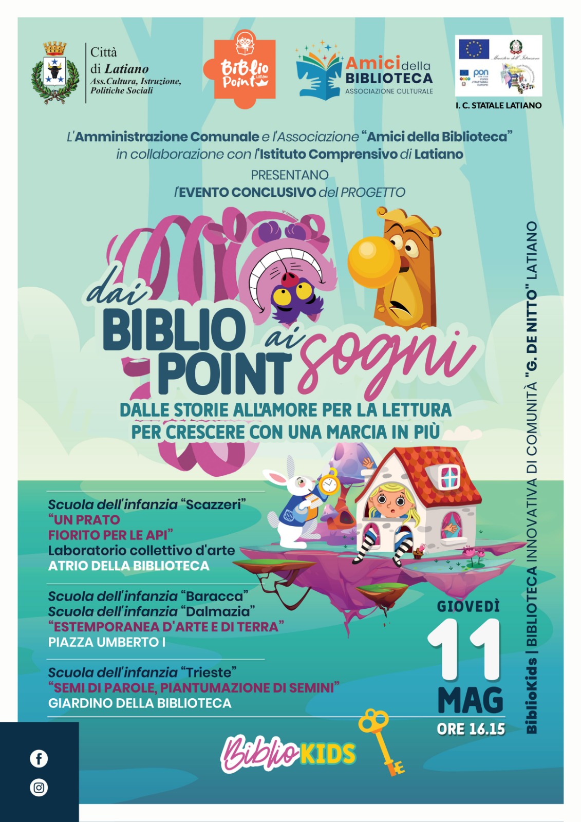 Dai Bibliopoint ai sogni" evento finale dei Bibliopoint, inserito nel Maggio dei Libri 2023, Rassegna RADICI, è un progetto promosso dall' Assessorato alla Cultura, Istruzione, Servizi sociali - Latiano realizzato dall' Associazione "Amici della Biblioteca" di Latiano che ha portato a scuola laboratori e attività di lettura, ha permesso ai genitori di conoscere l'importanza delle storie raccontate dalla loro voce, l'importanza per lo sviluppo cognitivo e del linguaggio, oltre al piacere di condividere con i propri bambini tempo e spazio unici: un tempo dedicato in modo esclusivo per una storia letta insieme e lo spazio della Biblio Kids nella Biblioteca Innovativa di Comunità "Gilberto De Nitto" .Tutto questo in fantastica sinergia con le insegnanti della Scuola dell'Infanzia Istituto Comprensivo Latiano.