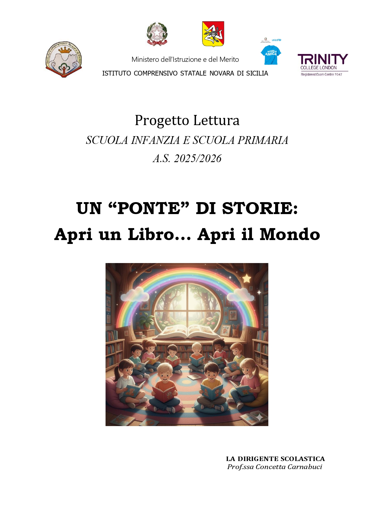 Il progetto “Lettura” dell’Istituto Comprensivo Novara di Sicilia, intitolato Un “ponte” di storie: Apri un Libro… Apri il Mondo, nasce da una visione che va oltre la pagina ed in un mondo dominato dalla velocità digitale, l’Istituto sceglie di riscoprire il valore del libro. Non come compito, ma come avventura: un’esperienza emotiva, spontanea e coinvolgente per superare i confini della scuola e nutrire la fantasia. Leggere, in questo progetto per la scuola primaria e la scuola dell’infanzia, è un potente strumento di crescita che permette di: