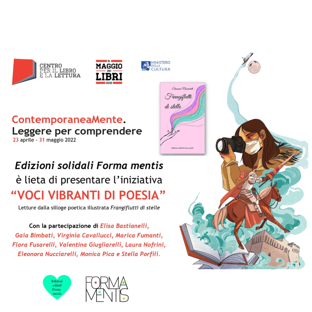 L'Evento Web "Voci vibranti di poesia" prevede un Reading di poesie dalla silloge poetica illustrata "Frangiflutti di stelle" di Eleonora Nucciarelli con la prefazione di Lisa Luzzi e le illustrazioni di: Cristiana Soriano, Laura Nofrini, Giusy Zambrano, Chiara Giugliarelli, Valentina Russo, Luisa Diaco, Monica Pica, Vittoria Maltese Bartolucci, Antonella Orsi e Milena Begnis, il cui ricavato della vendita sar?? devoluto all???Associazione Giacomo Sintini per la ricerca sul cancro.
