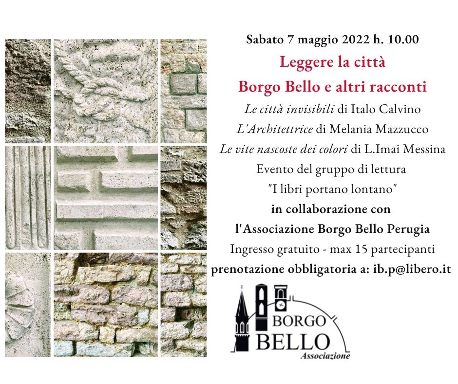 Il gruppo di lettura I LIBRI PORTANO LONTANO organizza una serie di letture, questa volta sui temi dei colori, della memoria e della rigenerazione, denominato LEGGERE LA CITTA'. BORGOBELLO E ALTRI RACCONTI.