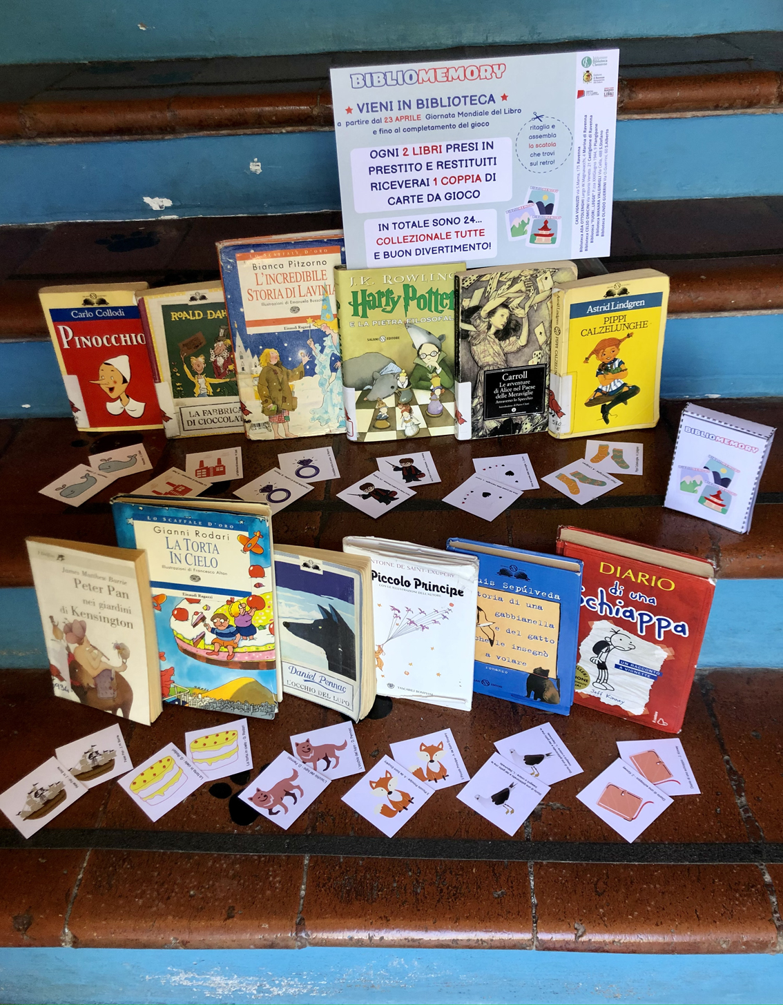 A partire dal 23 aprile scorso, Giornata Mondiale del Libro, ad ogni bambina e ad ogni bambino fra i 6 e gli 11 anni che si reca in biblioteca e prende in prestito 2 libri, viene regalata una coppia di carte Bibliomemory, per un totale di 24 carte collezionabili.