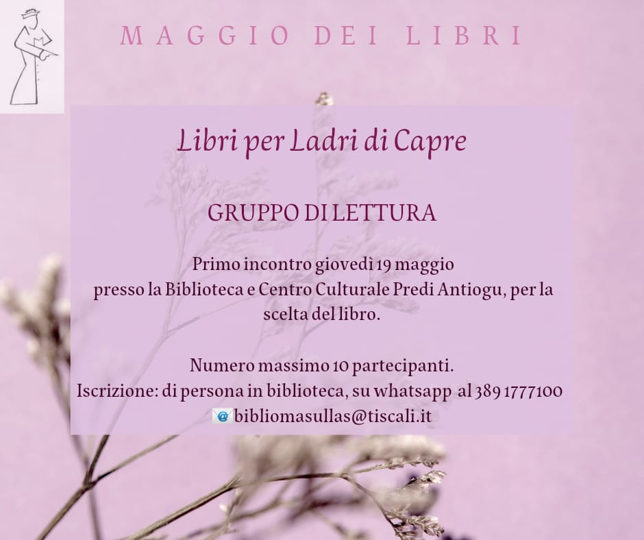 Modalit?? di partecipazione: per iscriversi sar?? sufficiente recarsi in biblioteca, oppure scrivere all???indirizzo bibliomasullas@tiscali.it, oppure su WhatsApp al 389 1777100.