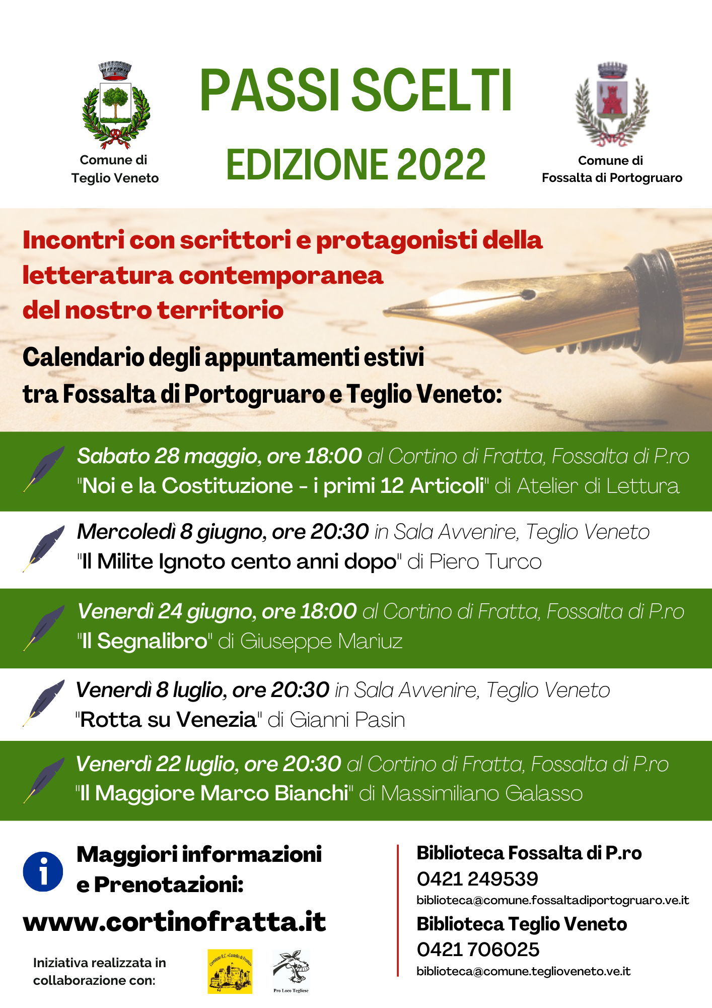 All'interno della rassegna di incontri con scrittori e protagonisti della letteratura contemporanea del nostro territorio, tra i Comuni di Fossalta di Portogruaro e Teglio Veneto, la Societ?? Culturale "L'Atelier di Lettura" propone - in collaborazione con l'ANPI di Portogruaro - un approfondimento sui primi 12 articoli della Costituzione della Repubblica Italiana.