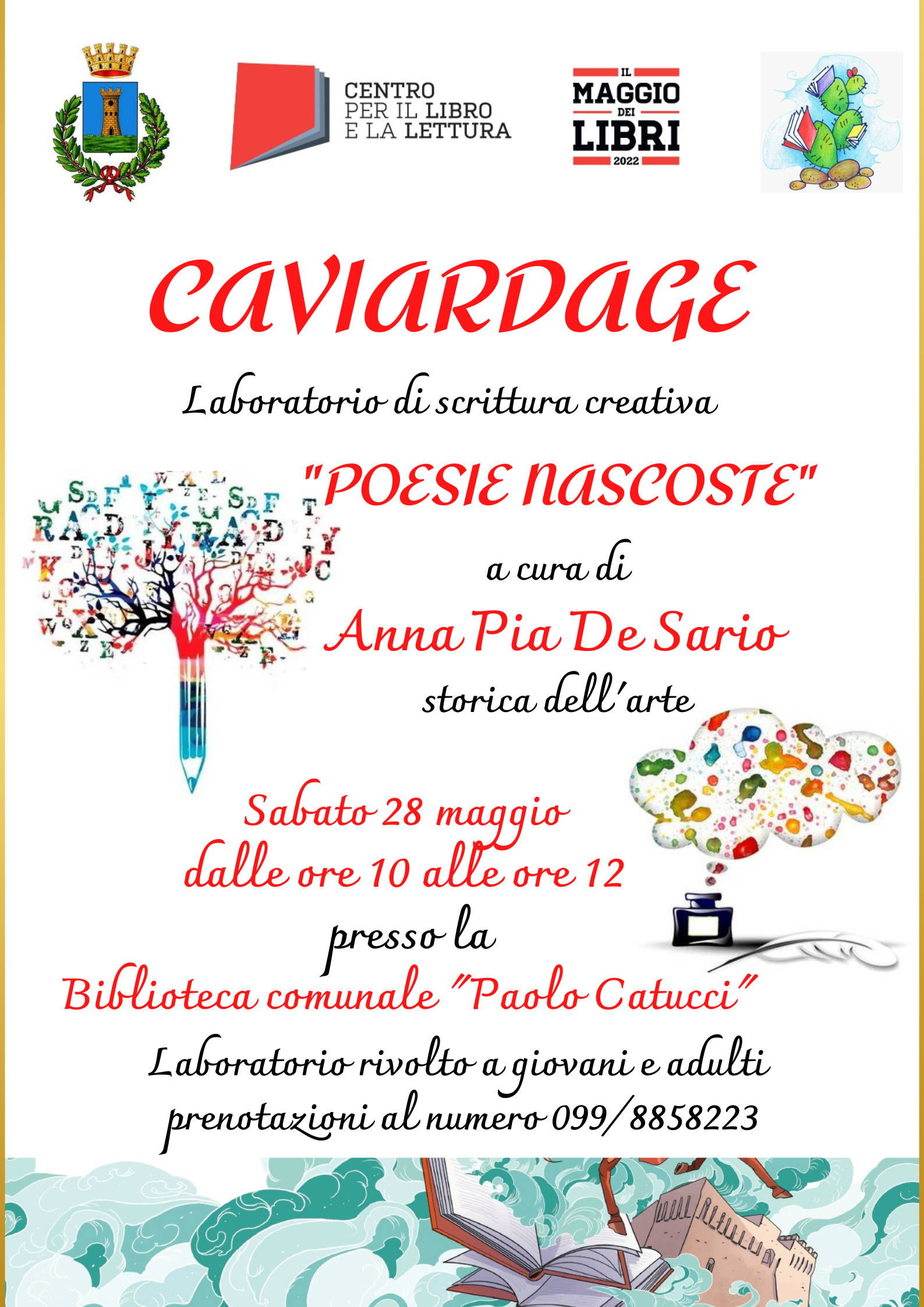 La scrittura creativa ?? ascoltare l'istinto, godere di esso e riconoscerne la gioia e la responsabilit??. Il Laboratorio di Caviardage si prefigge proprio questo obiettivo. Sabato 28 maggio dalle 10.00 alle 12.00 presso la Biblioteca comunale Paolo Catucci di Massafra.