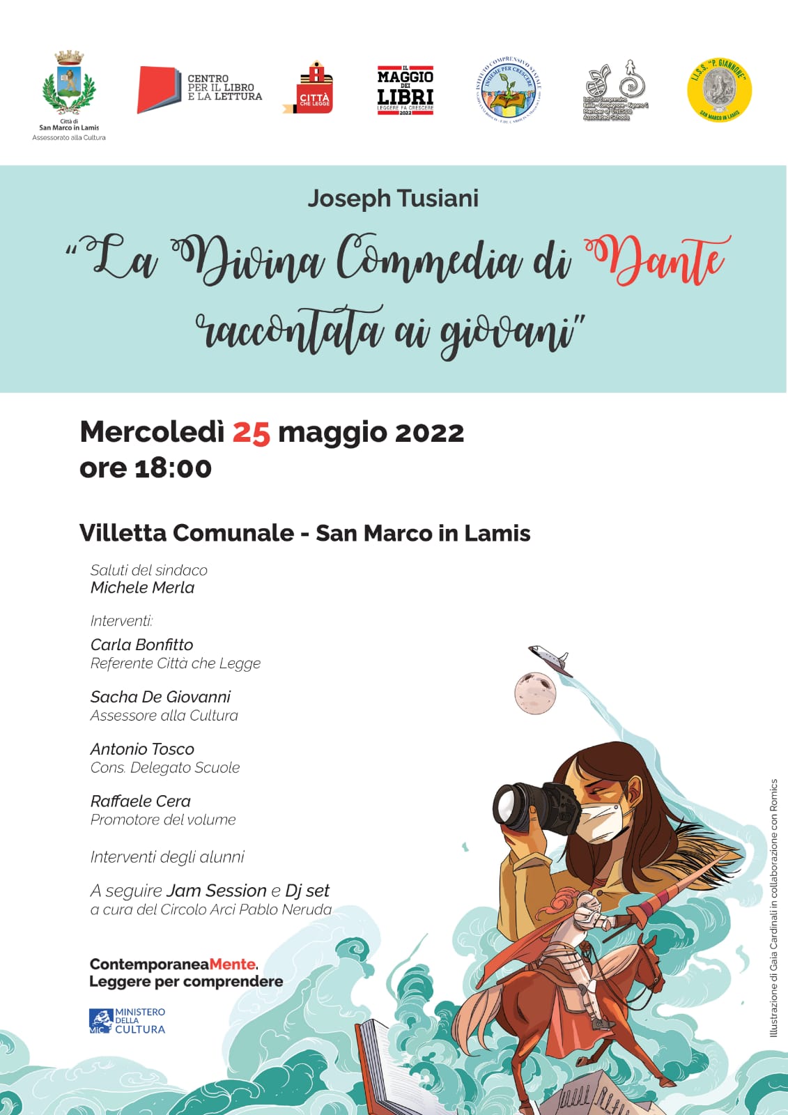 Il preside??Raffaele Cera, gi?? Dirigente Scolastico della scuola sammarchese e colto organizzatore di eventi culturali e letterari, partendo da uno scritto ricevuto dal compianto??Joseph Tusiani, ha provveduto a far tradurre in italiano, da??Cosma Siani, il suo libro??Dante???s Divine Comedy. As Told for Young People, che ?? una rilettura in chiave moderna del poema dantesco, lavoro che, gi?? a partire dal lontano 1965, permise anche ai giovani americani di ammirare l???opera del Sommo Poeta.