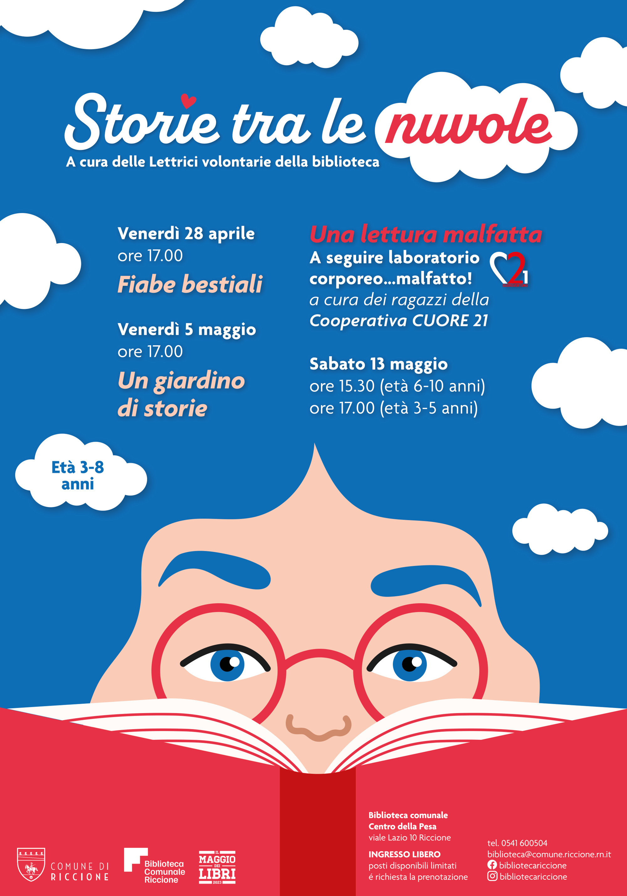 La Biblioteca comunale di Riccione propone un nuovo divertente ciclo di letture animate dal titolo "Storie tra le nuvole" rivolto a tutti i bambini dai 3 ai 10 anni.
