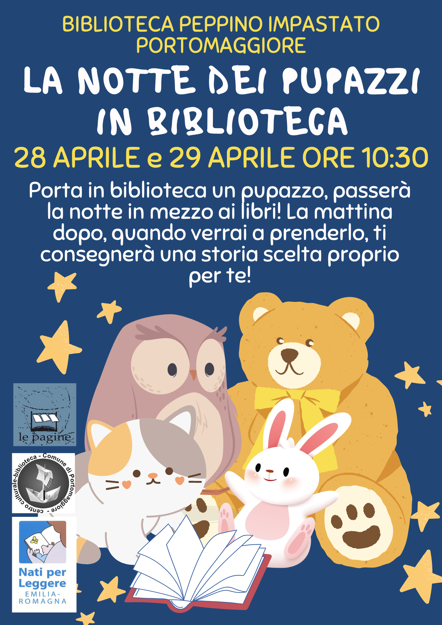 Una notte speciale in biblioteca in cui ai piccoli utenti viene chiesto di portare un pupazzo o un giocattolo e di lasciarlo a dormire tra gli scaffali. Il morbido amico passerà la notte tra i libri, a esplorare la biblioteca, leggere tante storie e combinare guai. La mattina dopo tutti i bambini verranno a riprendere i loro amici: leggeremo insieme delle storie e guarderemo insieme tutte le foto della notte in biblioteca dei pupazzi.