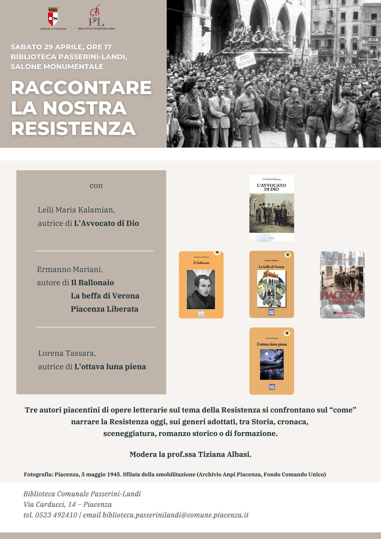 Incontro con Leili Maria Kalamian (“L’Avvocato di Dio”), Ermanno Mariani (“Il Ballonaio”, “La beffa di Verona”, “Piacenza Liberata”) e Lorena Tassara (“L’ottava luna piena”): gli autori piacentini di tre diverse opere letterarie sul tema si confrontano sul come narrare la Resistenza oggi, sui generi adottati, tra Storia, cronaca, sceneggiatura, romanzo storico o di formazione. Modera la professoressa Tiziana Albasi.