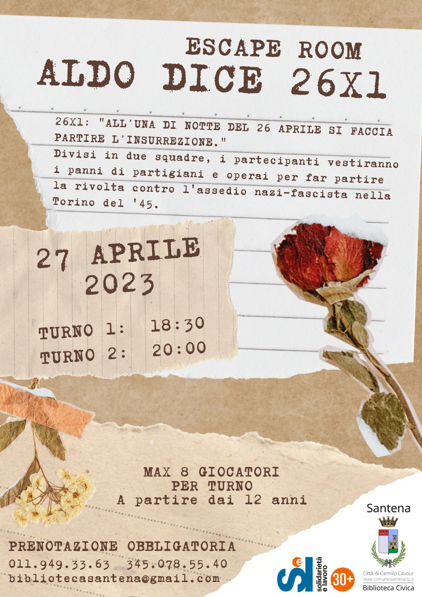 Aldo dice 26x1 è il messaggio che si stava aspettando, un telegramma che invitava all’entrata in azione nella città di Torino del 45, occupata dall’esercito nazi-fascista All’una di notte del 26 aprile si faccia partire l’insurrezione, questo il significato del messaggio. Gli operai occupino le fabbriche i partigiani invadano le città. Questo è ciò che dovrà fare la squadra che giocherà a questa escaperoom sulla resistenza a Torino. Divisi in due gruppi, i partecipanti vestiranno i panni degli operai da un lato e i partigiani dall’altro. Si troveranno a risolvere una serie di enigmi e giochi di logica, a collaborare a distanza e cercare oggetti nascosti per la biblioteca.