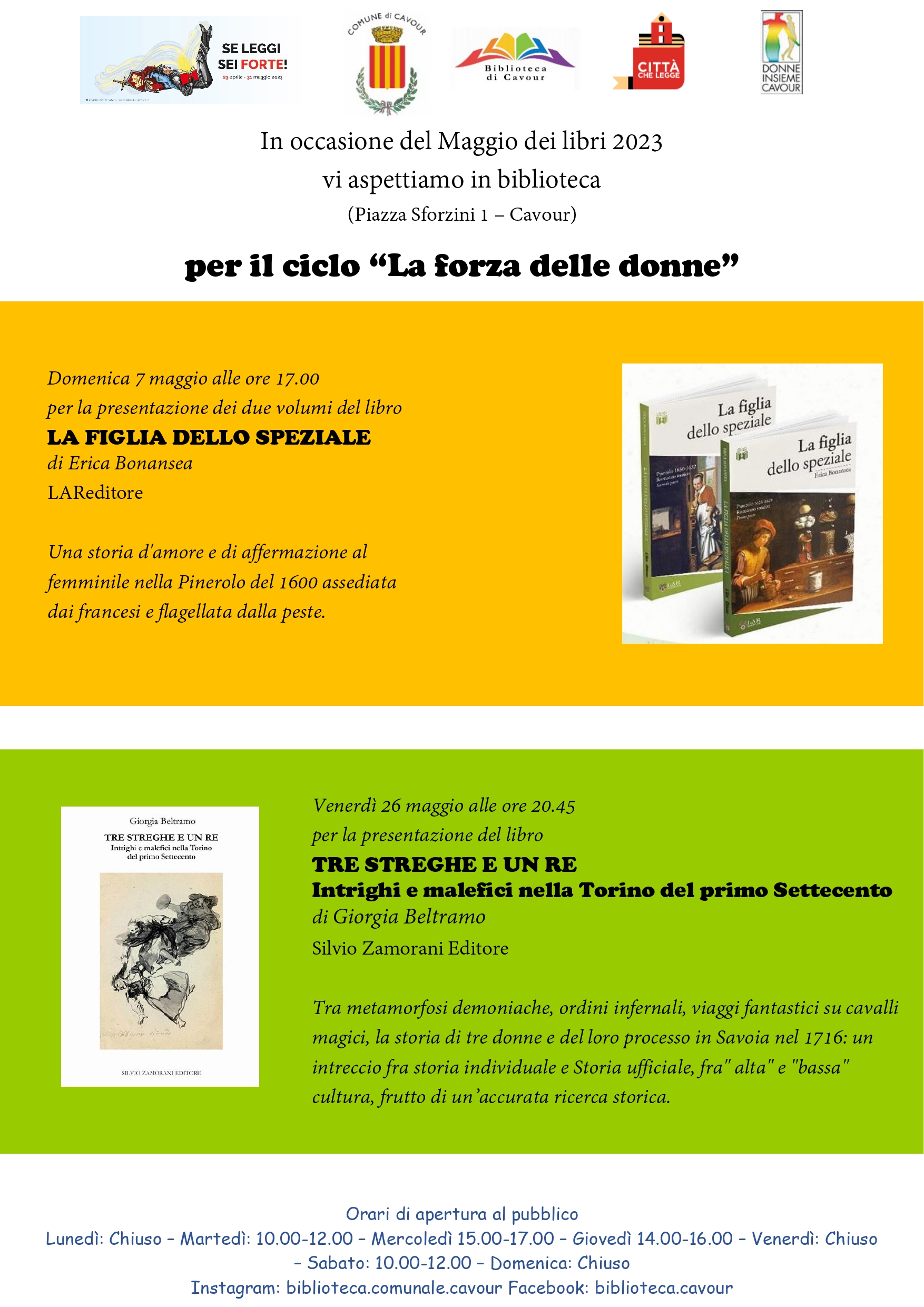 Erica Bonansea ne "La figlia dello speziale" racconta una storia d'amore e di affermazione al femminile nella Pinerolo del 1600 assediata dai francesi e flagellata dalla peste. Giorgia Beltramo autrice di "Tre streghe e un re - intrighi e malefici nella Torino del primo Settecento" racconta la storia di tre donne e del loro processo in Savoia nel 1716, un intreccio fra storia individuale e Storia ufficiale, fra "alta" e "bassa" cultura, frutto di un'accurata ricerca storica.