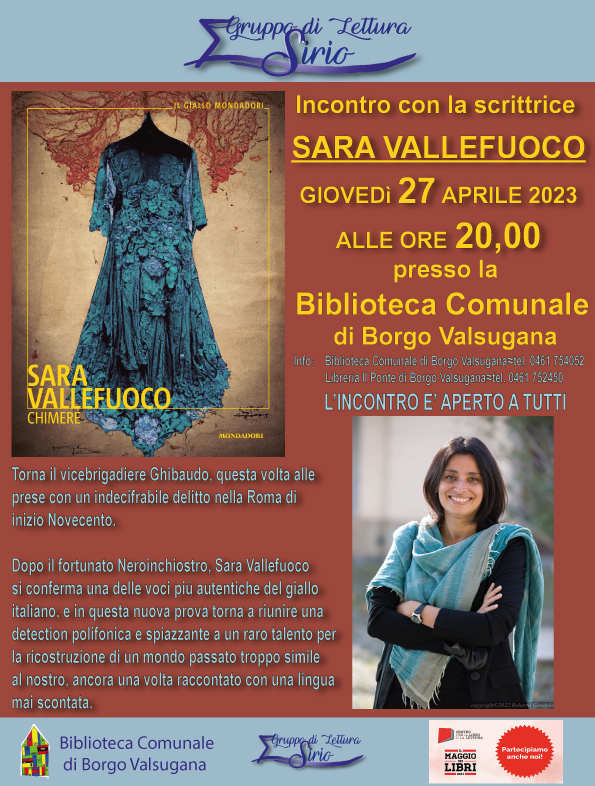 Il Gruppo di Lettura della Biblioteca Comunale di Borgo Valsugana (Tn) dialoga con la scrittrice Sara Vallefuoco che ha appena pubblicato il suo nuovo romanzo "Chimere" per i tipi della Mondadori.