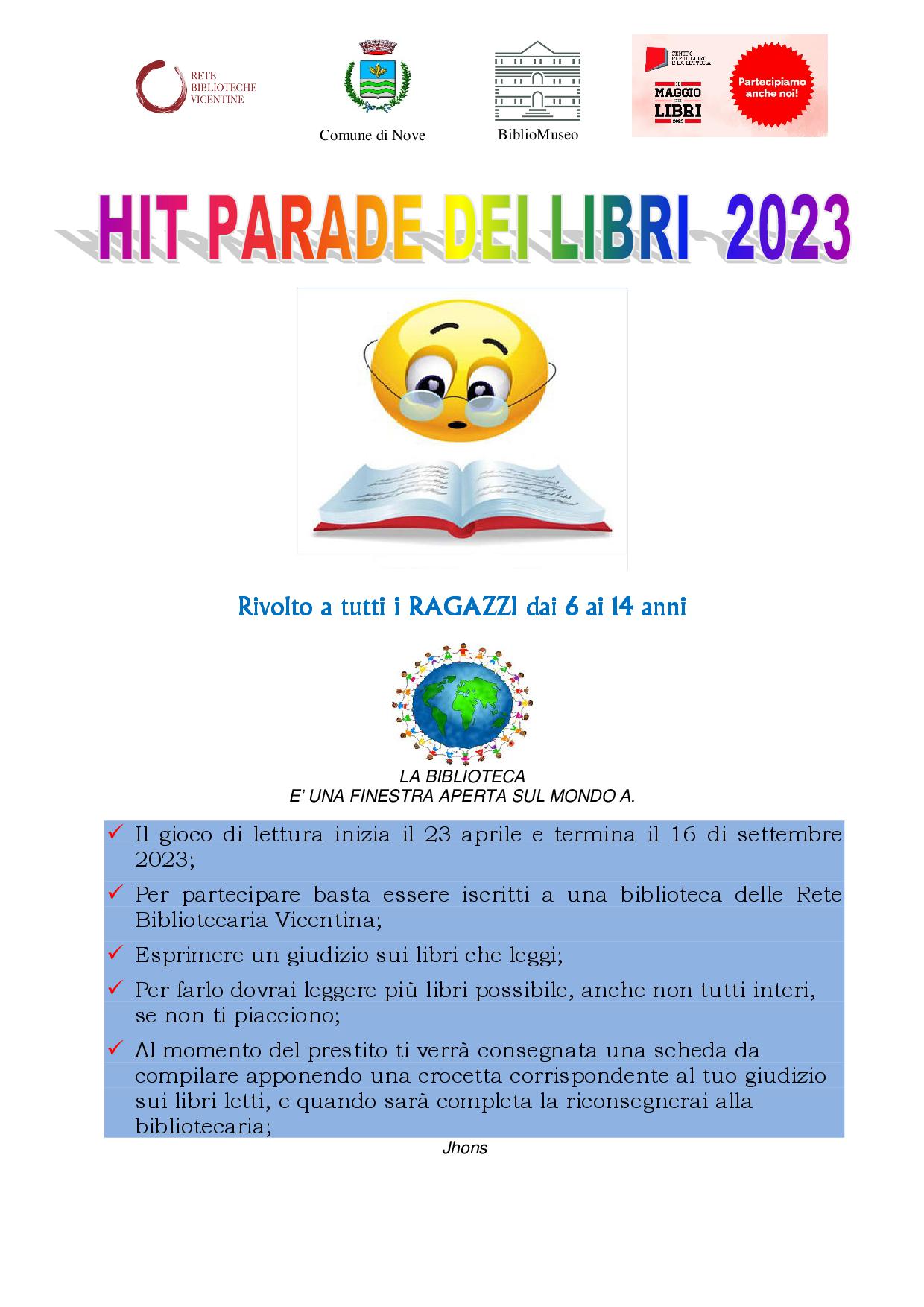 Un gioco di lettura dedicato ai ragazzi, dai 6 ai 14 anni. Per partecipare bisogna essere iscritti a una delle biblioteche della rete, e registrarsi all’Hit parade in biblioteca. Il gioco consiste nel leggere più libri possibile, anche non tutti interi, se non piacciono, non compilare questionari o fare riassunti, ma dare un voto sincero al libro letto.