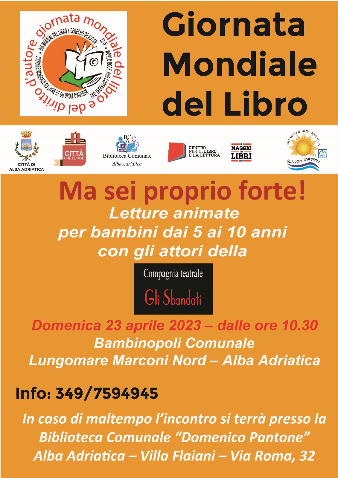In occasione della Giornata mondiale del libro e del diritto d'autore, istituita dall’Unesco, i bambini di età compresa tra i 5 e i 10 anni sono invitati a partecipare a “Ma sei proprio forte!" – Letture animate a cura della Compagnia teatrale "Gli Sbandati”. Per intercettare un nuovo pubblico di lettori, l’incontro non si terrà nei locali della biblioteca, ma presso la Bambinopoli Comunale, parco attrezzato per bambini sul lungomare nord di Alba Adriatica. L’attività vuole avvicinare i più piccoli al favoloso mondo del libro stimolando il piacere della lettura e contribuire alla loro crescita personale e culturale.