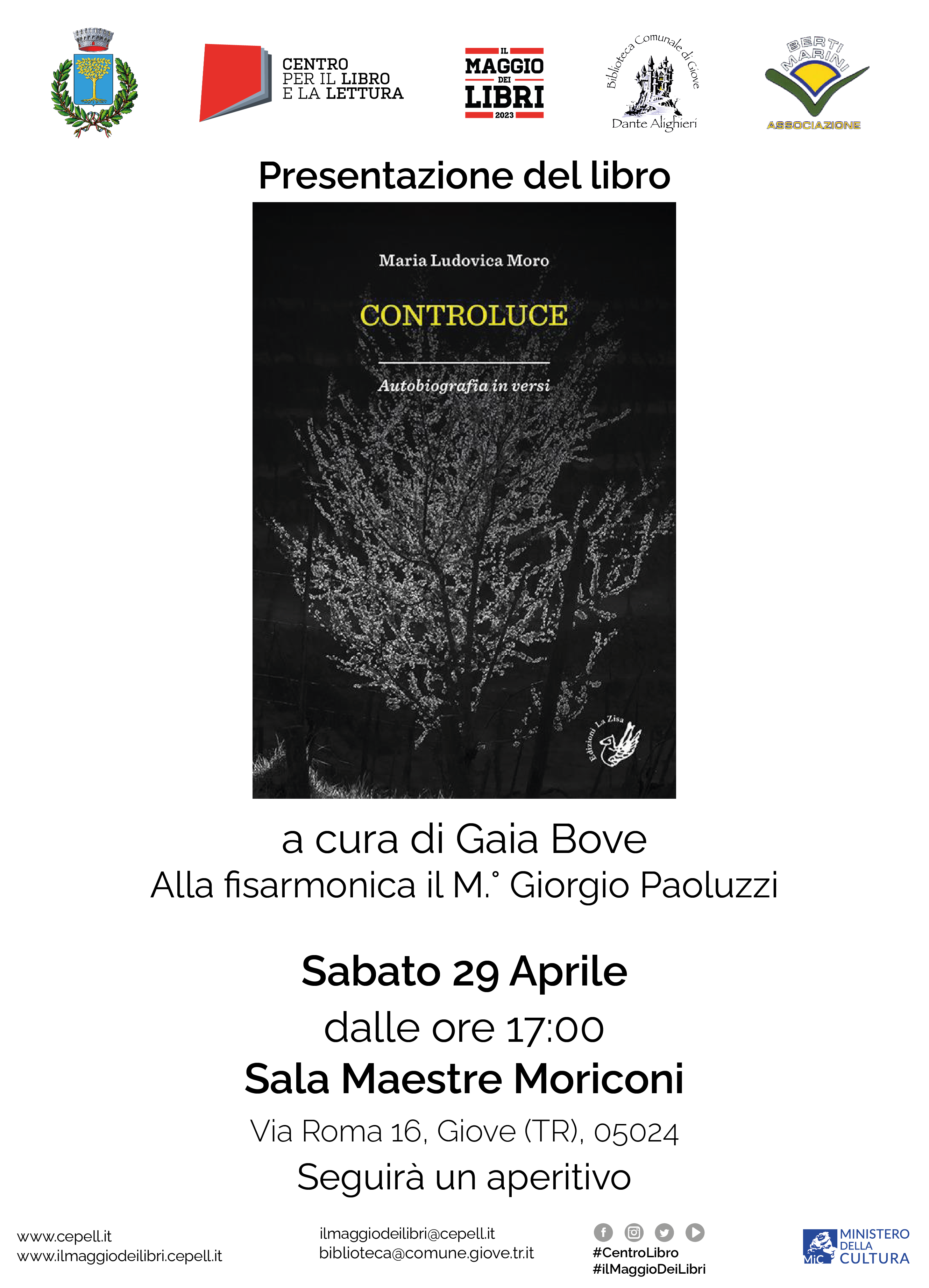 Presentazione del libro Controluce di Maria Ludovica Moro, un'autobiografia in versi. Presso la sala Maestre Moriconi di Giove dalle 17:00 alle 18:30 circa.