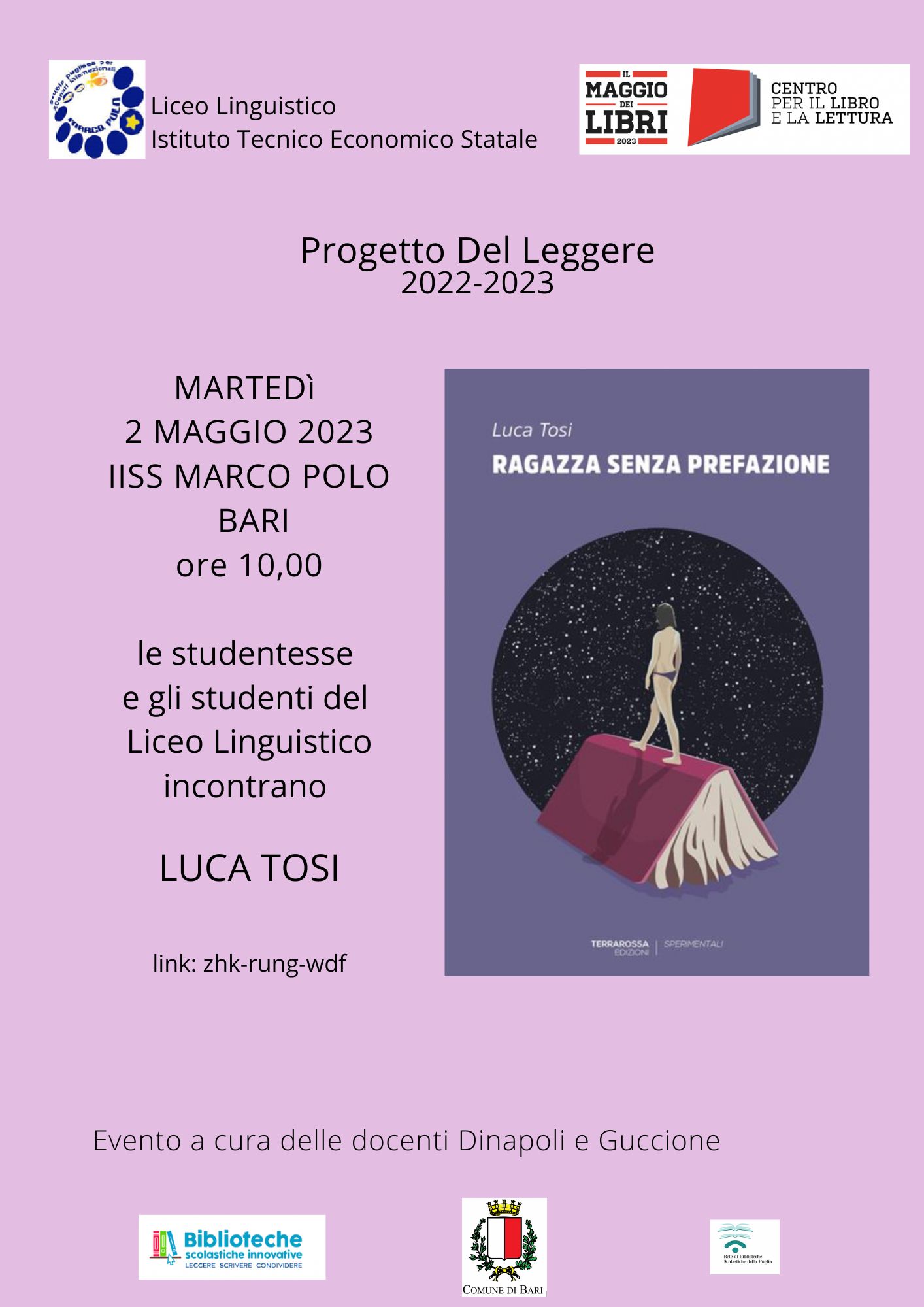 Secondo il format specifico del progetto lettura di istituto dal titolo Del Leggere, le studentesse e gli studenti di alcune classi del secondo biennio del Liceo Linguistico MARCO POLO di Bari dialogheranno su amore precario e precarietà di lavoro con Luca Tosi, autore del romanzo Ragazza senza prefazione (TerraRossa ed.).