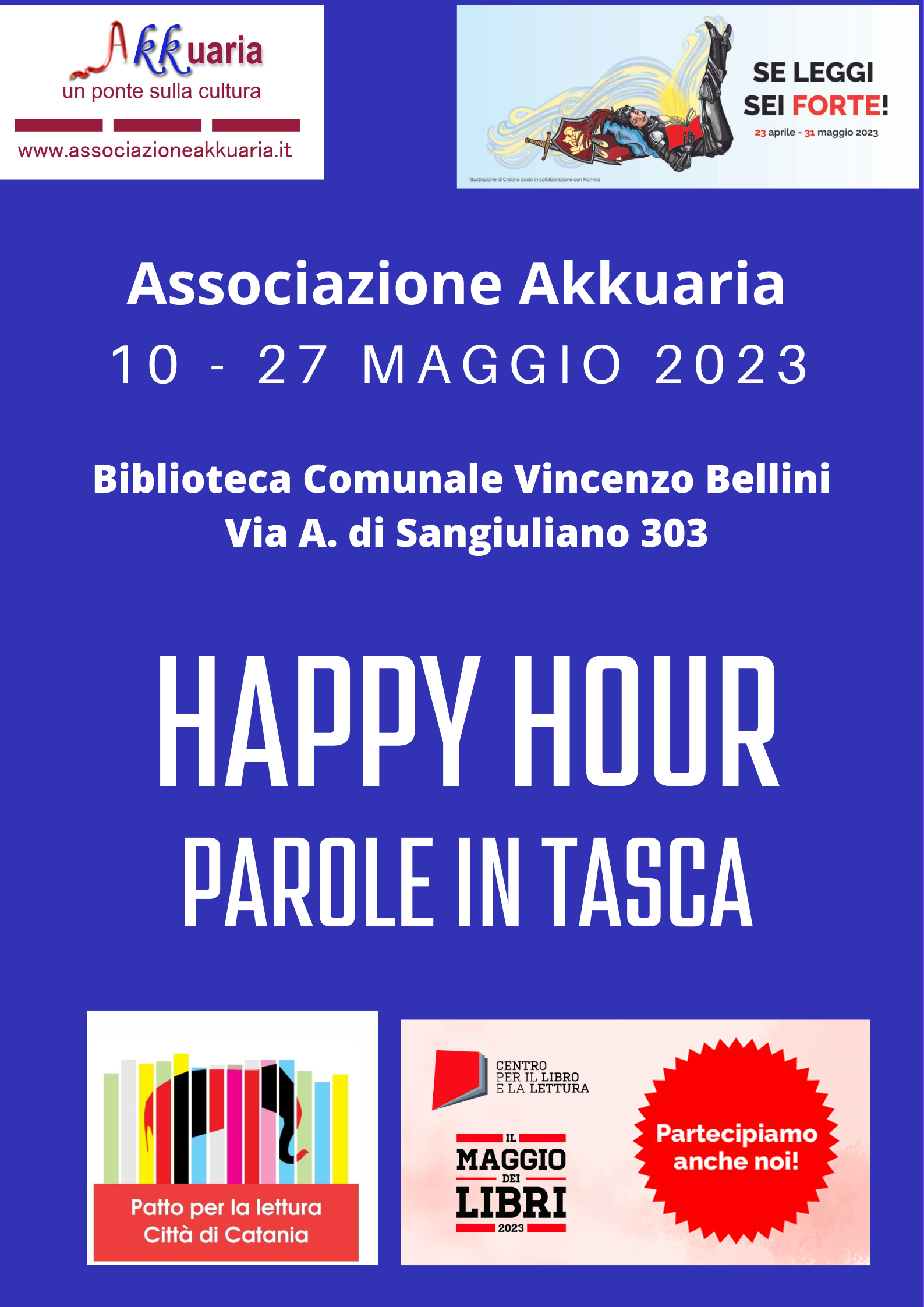 L'associazione culturale Akkuaria, in occasione della campagna nazionale “Il Maggio dei Libri” propone la rassegna letteraria “Happy Hour: Parole in tasca ”, nel corso della quale si svolgeranno presentazioni di libri di saggistica, narrativa e poesia, incontri/confronti con autori, registi, attori e artisti vari.