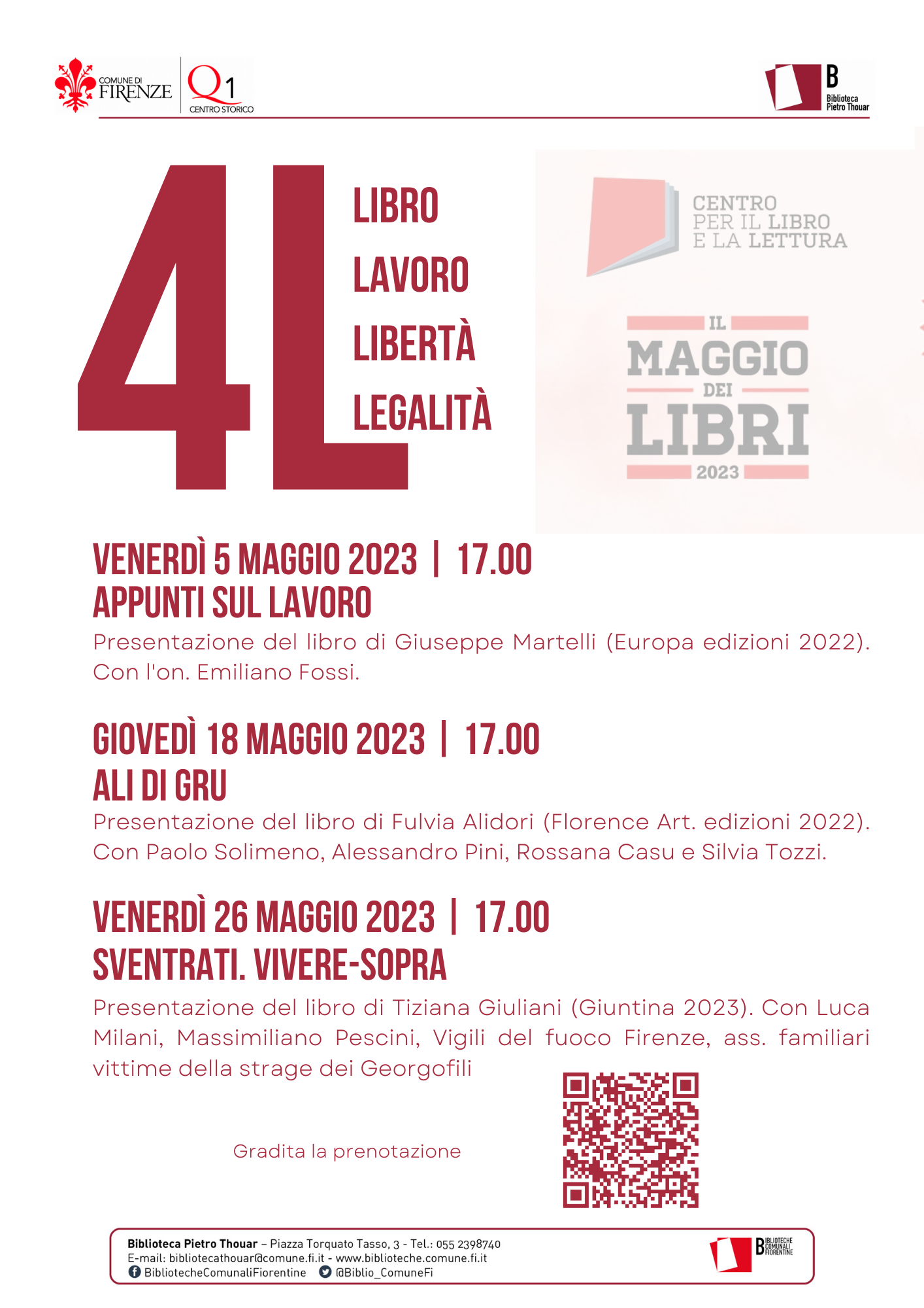 - giovedì 18 maggio alle 17.00 Fulvia Alidori, "Ali di gru" (Florence Art edizioni 2022), che racconta la vita del partigiano e sindacalista Silvano Sarti;