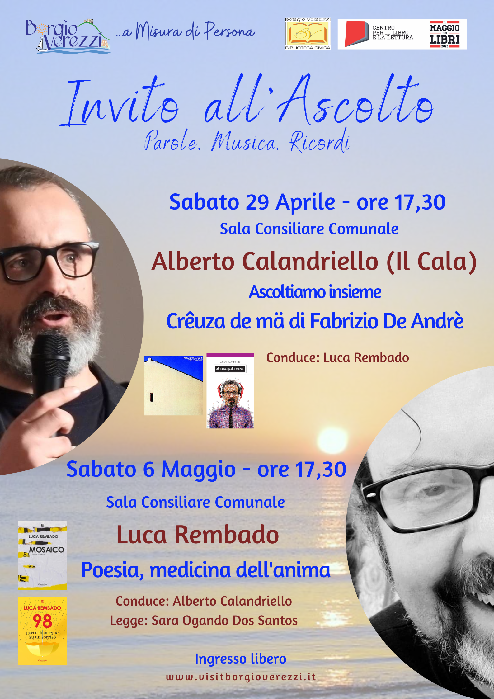 Alberto Calandriello (Il Cala) e Luca Rembado (Lu) hanno trovato nella musica e nelle parole la loro forza. Nel primo incontro, ascolto guidato di testi e musiche di "Creuza de ma" di Fabrizio De Andrè, commentate dal Cala, autore di "Abbassa quello stereo!"; nel secondo incontro, presentazione della storia e dei libri di poesie di Luca "Mosaico" e "98 gocce di pioggia su un sorriso", con letture di Sara Ogando Dos Santos. Gli autori si presenteranno reciprocamente nei due incontri: "Invito all'Ascolto" è un progetto unico, a due voci, rivolto a chi ama condividere la forza delle parole e della musica.