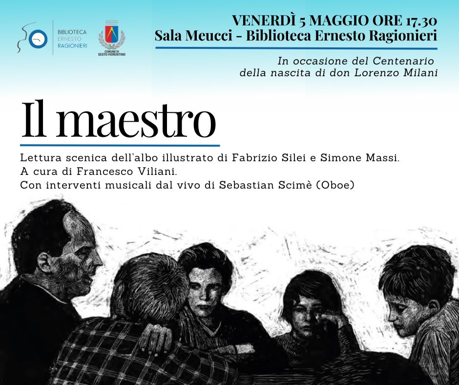 In occasione del Centenario della nascita di don Lorenzo Milani, una lettura scenica dell’albo illustrato "Il Maestro" di Fabrizio Silei, accompagnato dalle immagini di Simone Massi. A cura di Francesco Viliani, con interventi musicali dal vivo di Sebastian Scimè.