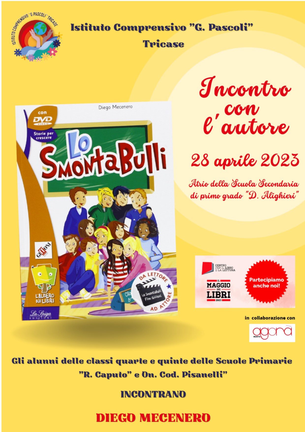 Diego Mecenero, autore de "Lo smontabulli", incontrerà gli alunni delle classi quarte e quinte delle Scuole Primarie dell'I.C. "G. Pascoli" a Tricase il 28 aprile presso l'atrio della Scuola Secondaria di primo grado "D. Alighieri". Un incontro che si prefigge di coinvolgere le ragazze e i ragazzi in un dialogo vivace intorno a un tema a loro vicino. L'iniziativa rientra nelle attività che l'Istituto Comprensivo si prefigge di realizzare in vista del Maggio dei Libri 2023 sulla scia del tema "Se leggi sei forte!".