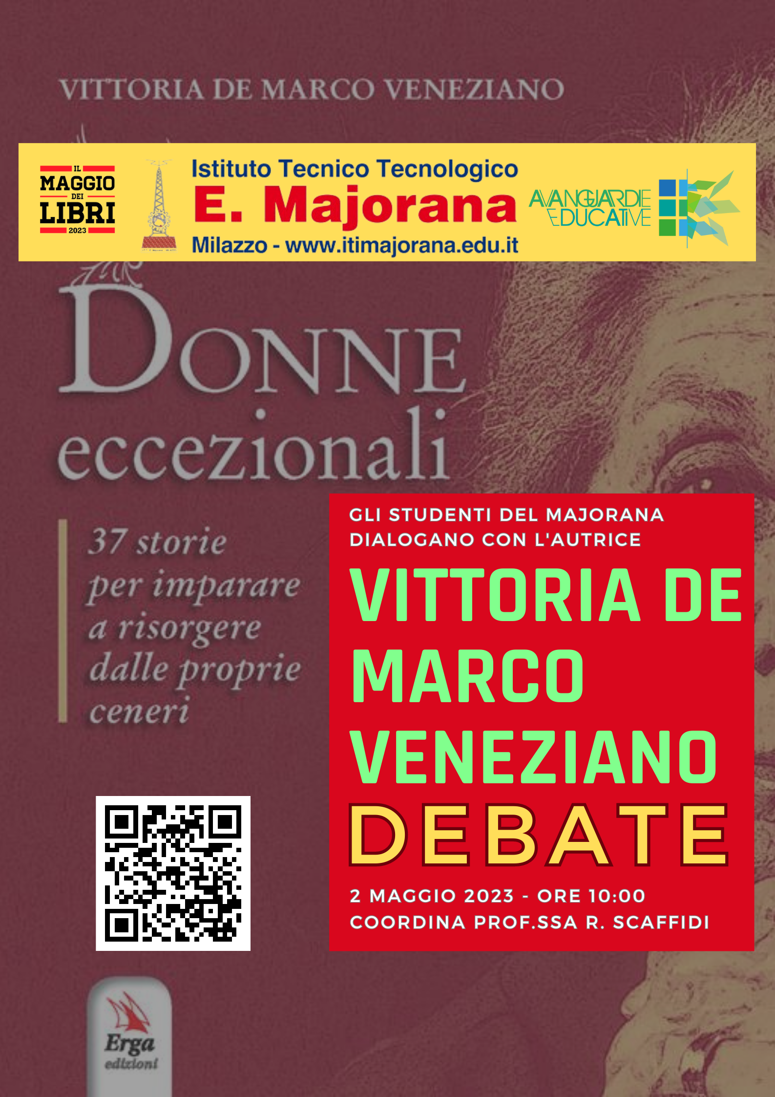 L'autrice Vittoria de Marco Veneziano, partecipa ad una attività di Debate con gli alunni dell'Istituto Tecnico Tecnologico Ettore Majorana di Milazzo, sui temi del suo libro dal titolo " Donne eccezionali, 37 storie per imparare a risorgere dalle proprie ceneri". Le attività si svolgeranno presso l'aula magna dell'istituto, il 2 maggio 2023 a partire dalle ore 10:00. Coordina l'evento la prof,ssa Rossella Scaffidi. L'iniziativa è patrocinata dall'Associazione Culturale Teseo di Milazzo e rientra tra le azioni