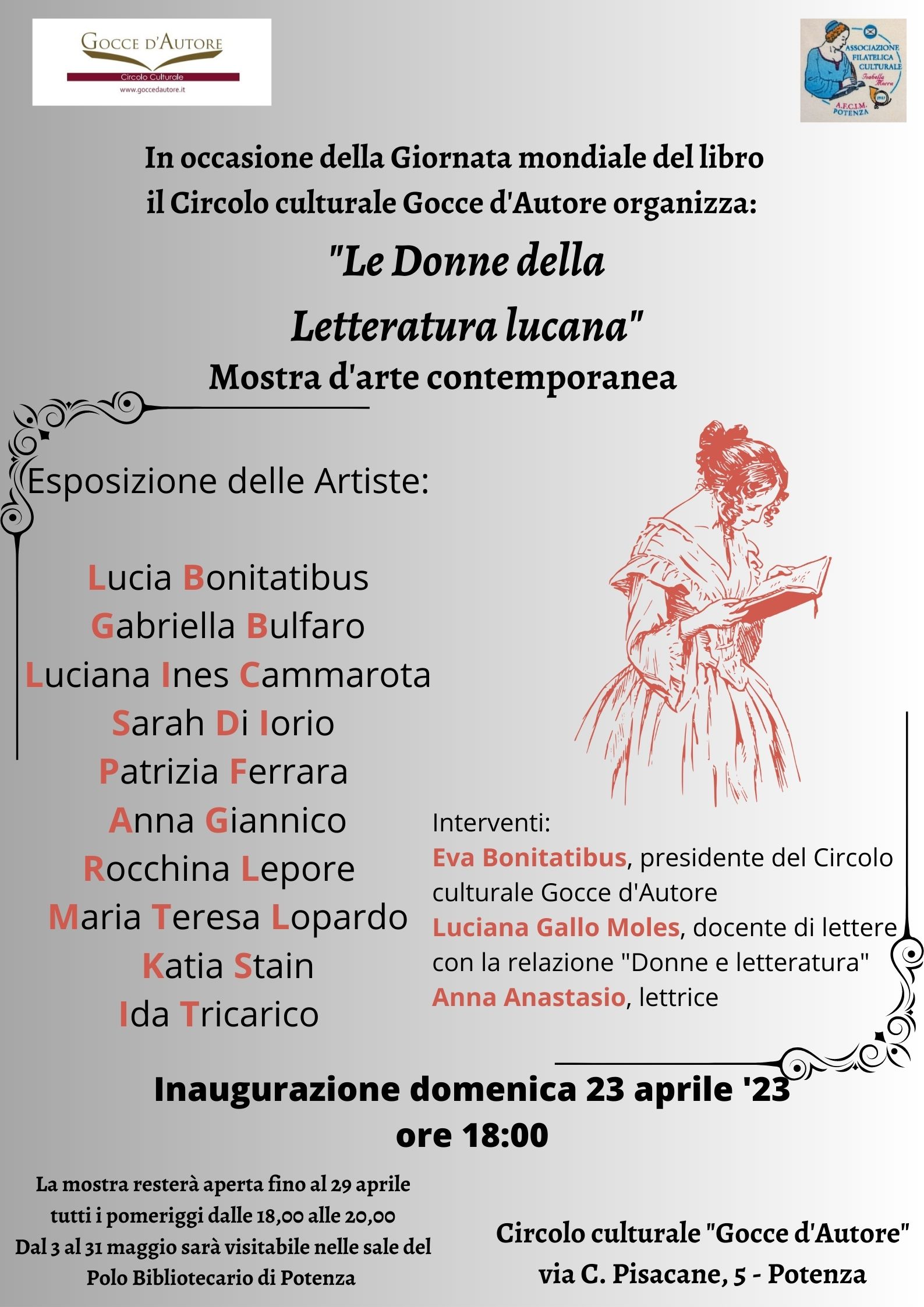 L'inaugurazione si terrà domenica 23 aprile '23 alle 18,00 nella sede del Circolo culturale Gocce d'Autore in via Pisacane n. 5 a Potenza. Al vernissage, dopo il saluti del Presidente del Circolo, Eva Bonitatibus, interverrà la professoressa Luciana Gallo Moles con una relazione dal titolo "Donne e Letteratura". I versi scelti dalla