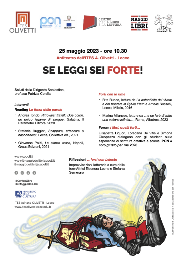 L'ITES Olivetti di Lecce realizza un percorso articolato in tre eventi in cui gli studenti dialogheranno con autori, autrici, poetesse e attrici su differenti esperienze di lettura e scrittura sulla scia dei tre filoni tematici dell'edizione 2023 de "Il Maggio dei libri". L'iniziativa si configura come un momento di confronto delle attività di lettura ad alta voce, di social reading e dei laboratori di scrittura creativa realizzati nel corso dell'anno scolastico per la promozione del piacere della lettura nell'ambito della progettualità curricolare ed extracurricolare dell'istituto.