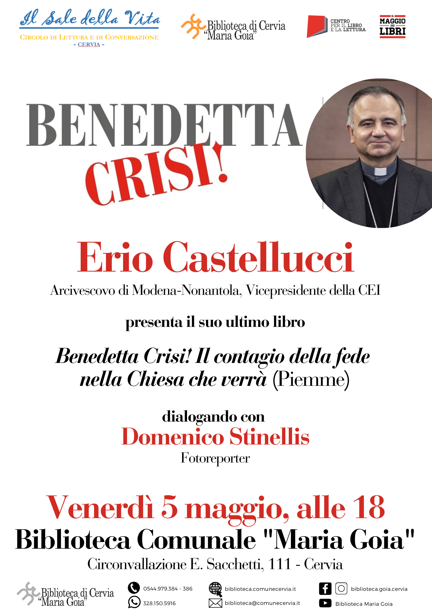 Venerdì 5 maggio, alle 18 presso la Biblioteca Comunale Maria Goia, "Benedetta crisi!", incontro con Erio Castellucci, Arcivescovo di Modena-Nonantola, Vicepresidente della CEI, che presenta il suo ultimo libro "Benedetta Crisi! Il contagio della fedenella Chiesa che verrà" (Piemme) dialogando con Domenico Stinellis, Fotoreporter.