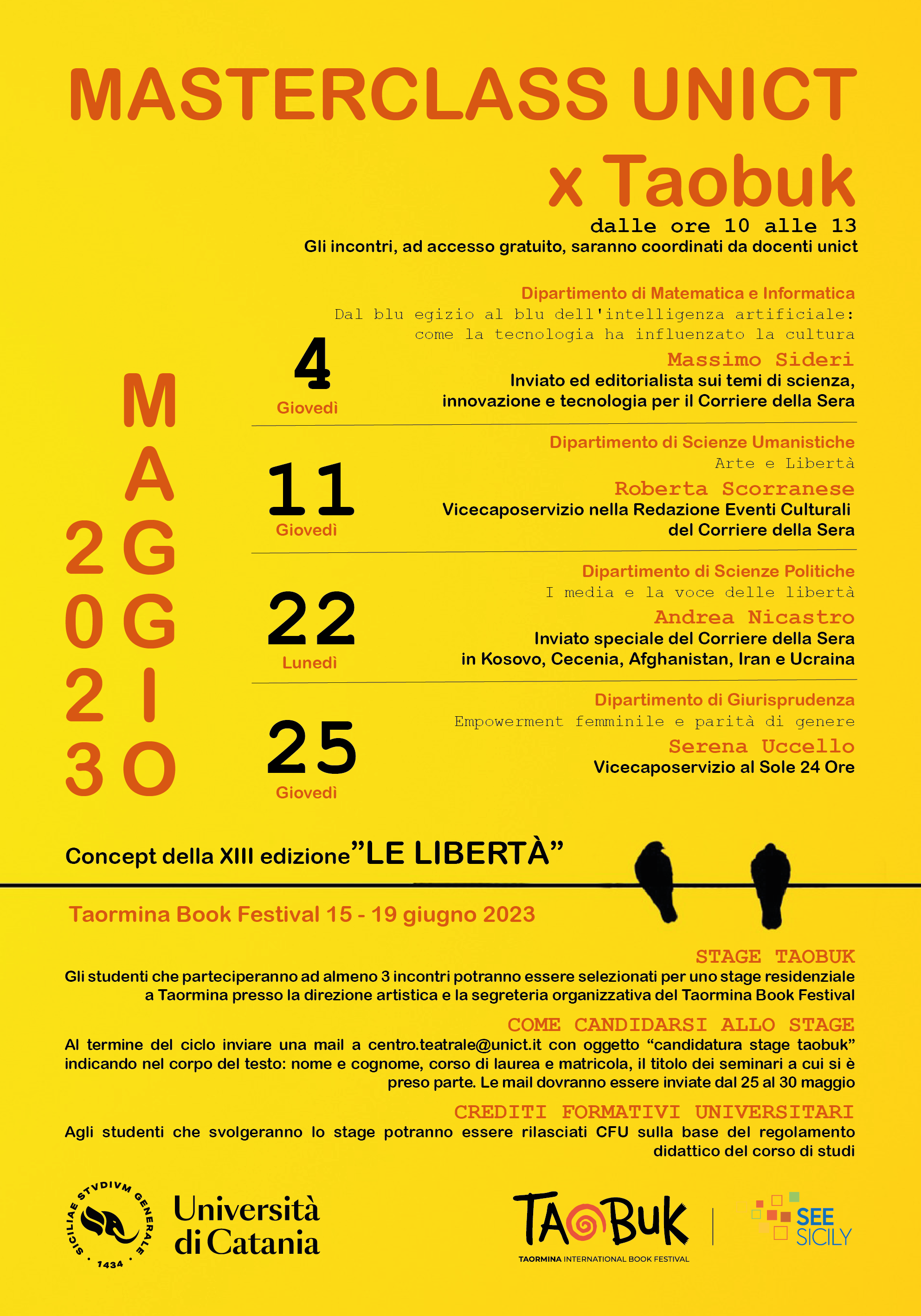La proficua e pluriannuale collaborazione fra il festival e l’Ateneo etneo sfocia nel corso di questa XIII edizione, dedicata alle “Libertà”, in un progetto speciale pensato per gli studenti universitari, destinatari delle quattro masterclass condotte da prestigiose personalità del mondo culturale e scientifico.