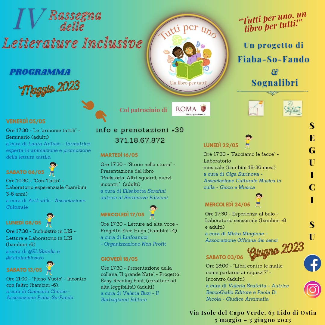 La Rassegna delle letterature inclusive torna per il quarto anno, con un’edizione davvero speciale e un calendario fittissimo di appuntamenti. Nella bellissima cornice del giardino della Libreria Sognalibri di Ostia esploreremo in compagnia di formatori, professionisti, autori ed editori tanti modi per fare inclusione a partire dalle diverse eccezioni di libro, per ritrovarci tutti insieme intorno alla stessa esperienza, pur nella ricca diversità di ciascuno.