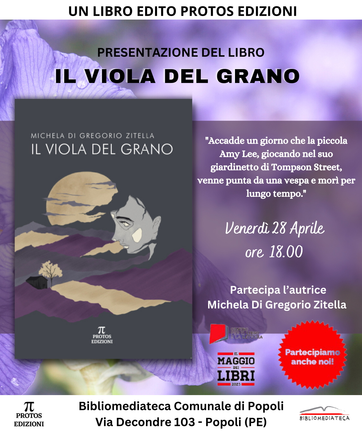 Venerdì 28 aprile 2023 alle ore 18.00 ospiteremo la giovane autrice Michela Di Gregorio Zitella con il suo primo romanzo "Il viola del grano" Protos Edizioni.