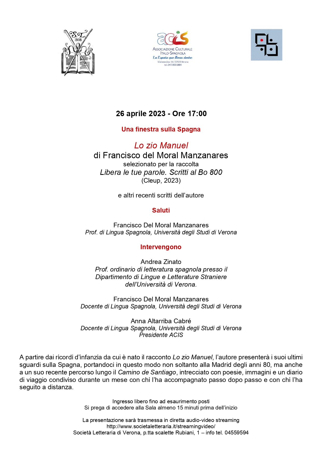 Incontro con lo scrittore e professore Francisco del Moral. A partire dai ricordi di infanzia da cui è nato il racconto che presenterà, l'autore, ci porterà il suo sguardo sulla Spagna.