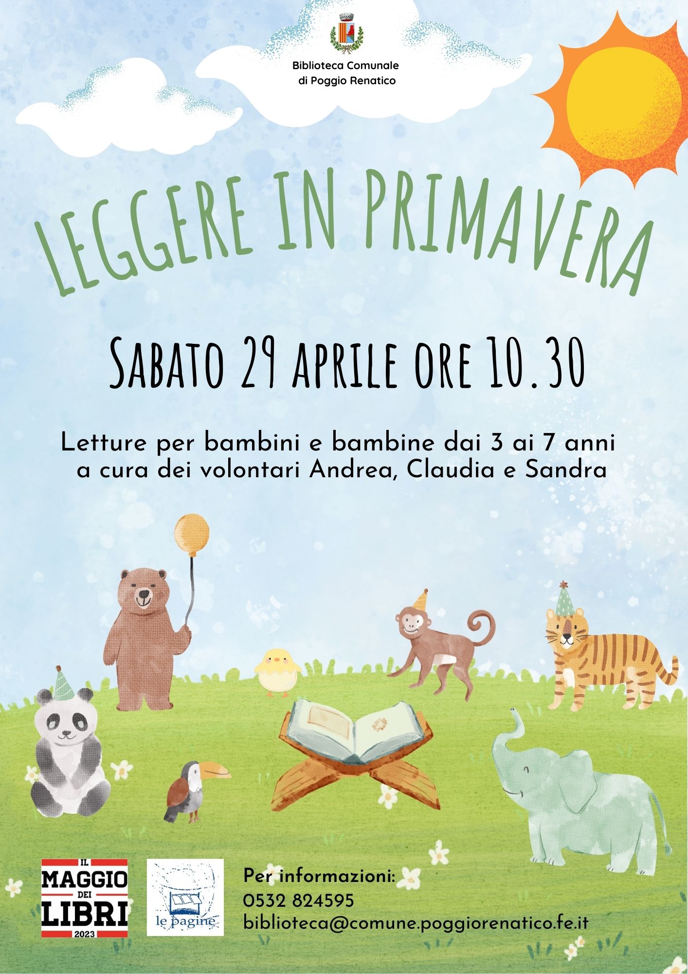 In occasione del Maggio dei libri 2023, nella Biblioteca Comunale di Poggio Renatico sabato 29 aprile ore 10:30 vi aspetta la lettura "Leggere in primavera", a cura dei tre lettori volontari Andrea, Claudia e Sandra.