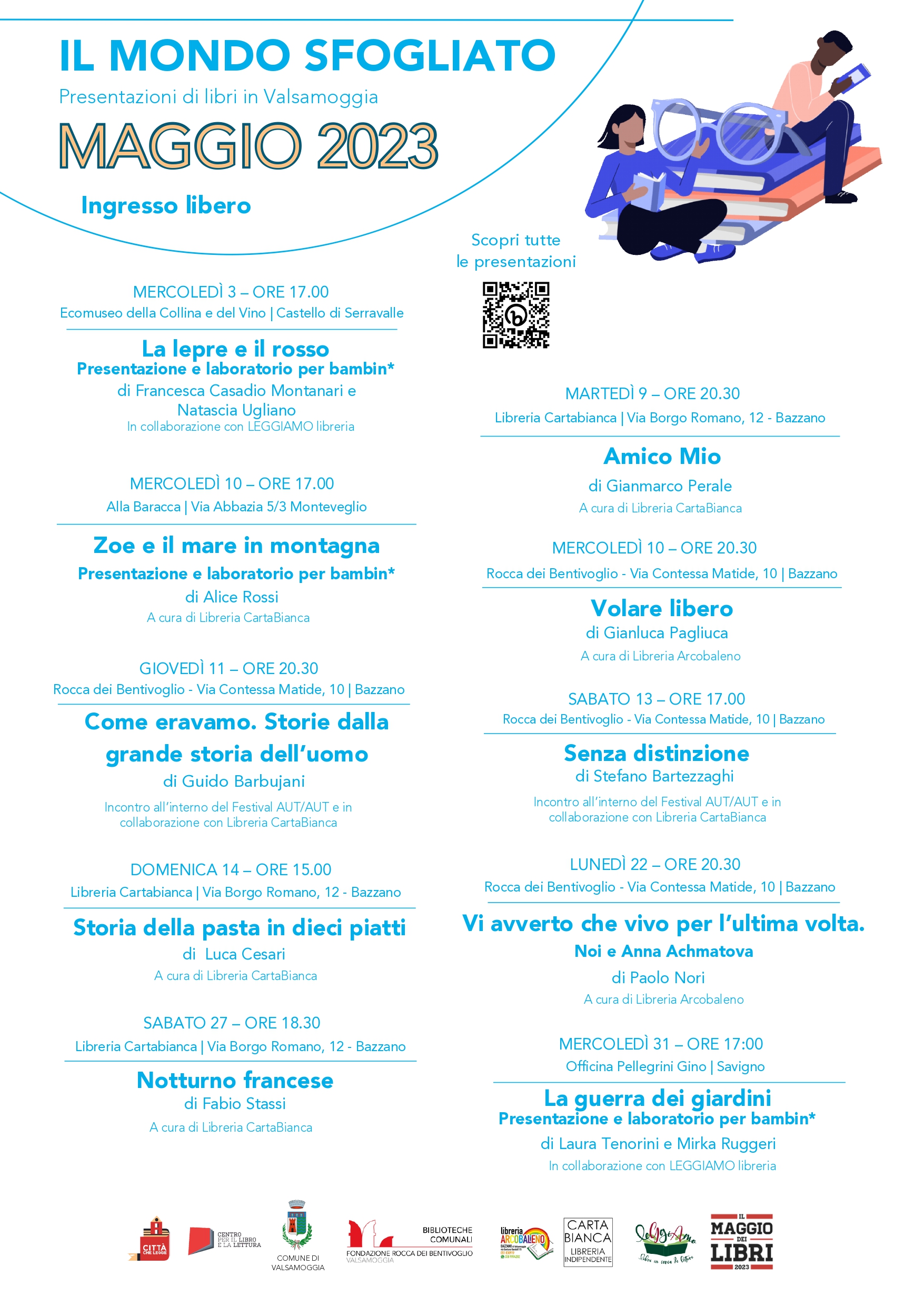 Le biblioteche e le librerie di Valsamoggia organizzano una serie di presentazioni di libri su tutto il territorio per conoscere nuovi autori, incontrarli e confrontarsi con le loro storie. Non solo libri per un pubblico adulto, ma anche presentazioni dedicate ai più giovani.