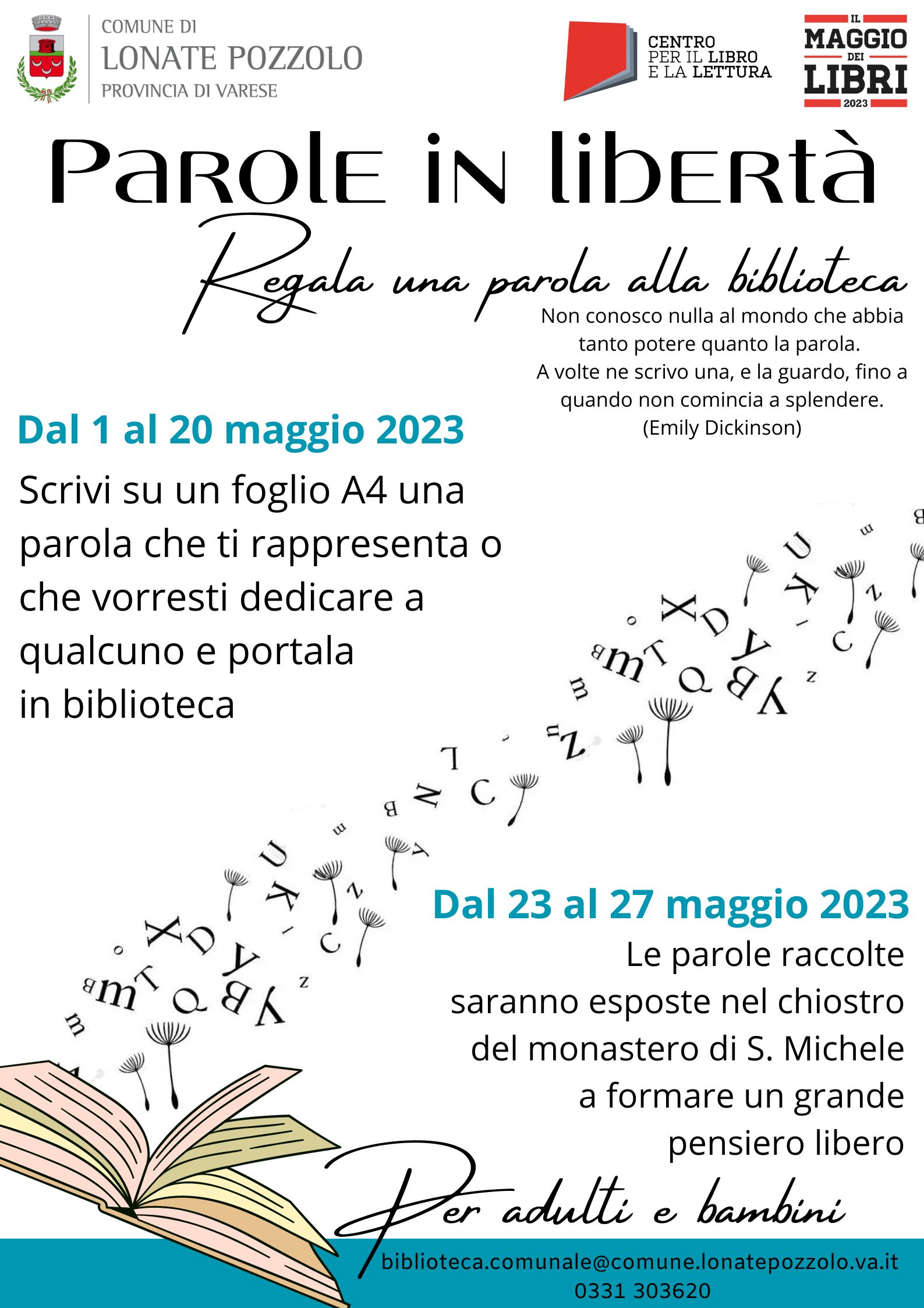 Per tutto il mese di maggio la biblioteca invita gli utenti di tutte le età a scrivere su un foglio una parola che li rappresenta, che vorrebbero dedicare a qualcuno o che vorrebbero semplicemente sentire più spesso. Chi vorrà potrà anche motivare la scelta della parola con una spiegazione o con una decorazione artistica.