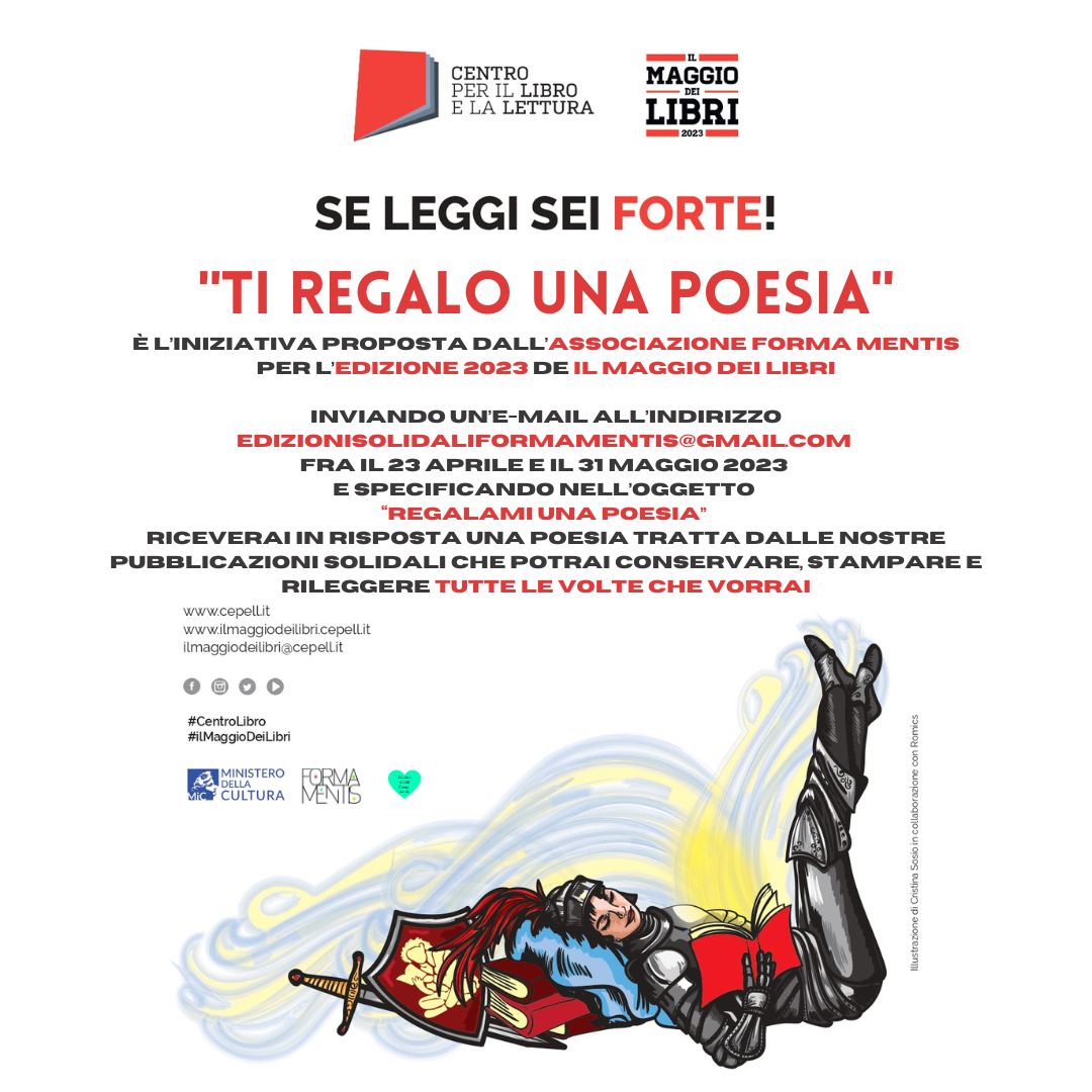 Inviando un’e-mail all’indirizzo edizionisolidaliformamentis@gmail.com fra il 23 aprile e il 31 maggio 2023 e specificando nell’oggetto “Regalami una poesia” riceverai in risposta una poesia tratta dalle nostre pubblicazioni solidali che potrai conservare, stampare e rileggere tutte le volte che vorrai.