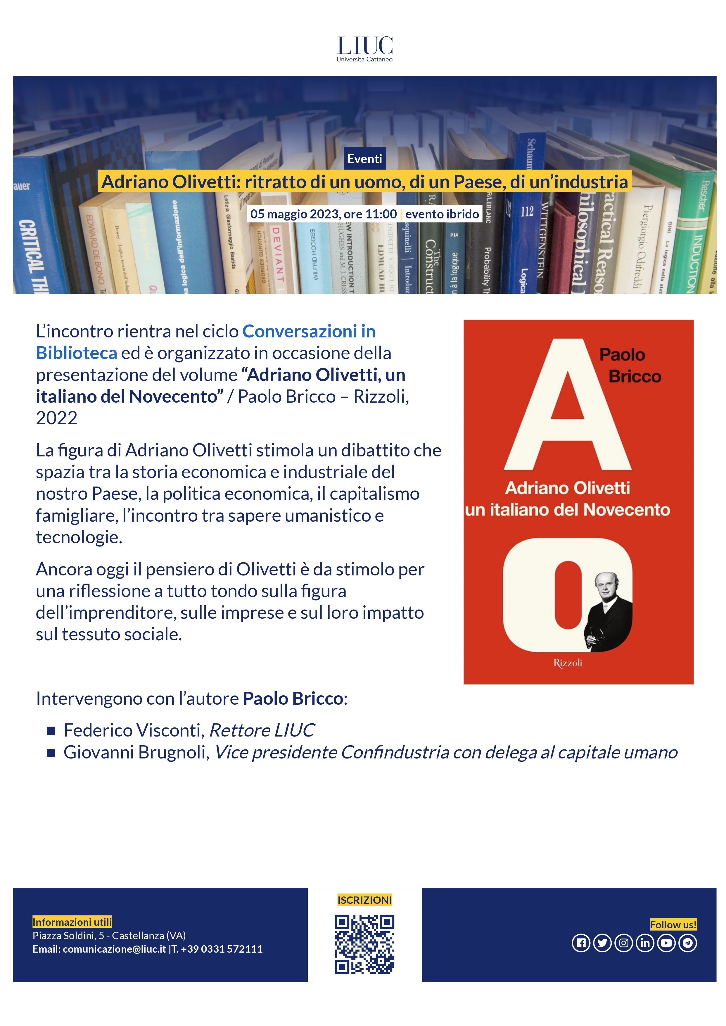L’incontro rientra nel ciclo "Conversazioni in Biblioteca" della Biblioteca Mario Rostoni dell'Università Carlo Cattaneo ed è organizzato in occasione della presentazione del volume “Adriano Olivetti, un italiano del Novecento” / Paolo Bricco – Rizzoli, 2022
