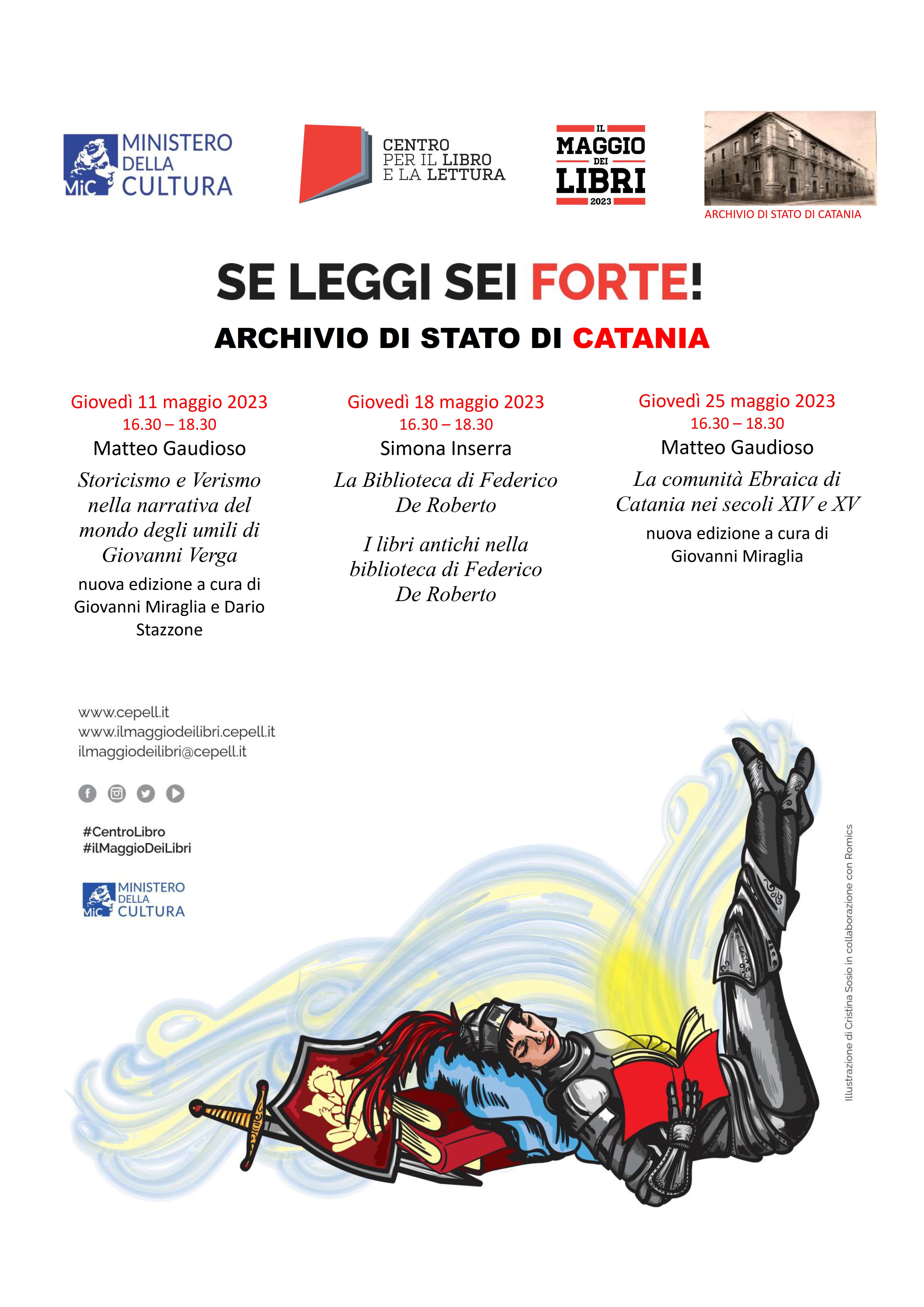 L'Archivio di Stato di Catania partecipa anche quest'anno al Maggio dei Libri con tre appuntamenti, previsti giorno 11, 18 e 25 maggio dalle 16:30 alle 18:30. Verranno presentati due libri di Matteo Gaudioso nella nuova veste editoriale curata da Giovanni Miraglia e due libri di Simona Inserra sulla Biblioteca di Federico De Roberto.