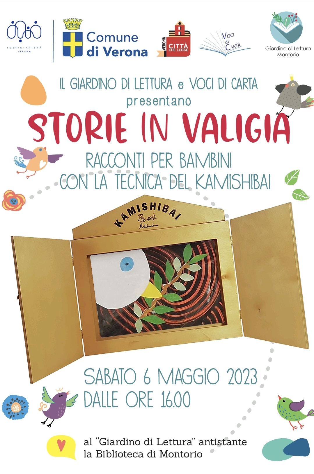 Racconti per bambini con il teatro Kamishibai: una tecnica giapponese di narrazione orale in cui chi racconta fa scorrere le storie con le immagini del racconto.. Alla fine si lasceranno i bambini liberi di girare nel Giardino di Lettura dove saranno lasciati libri e giochi di legno