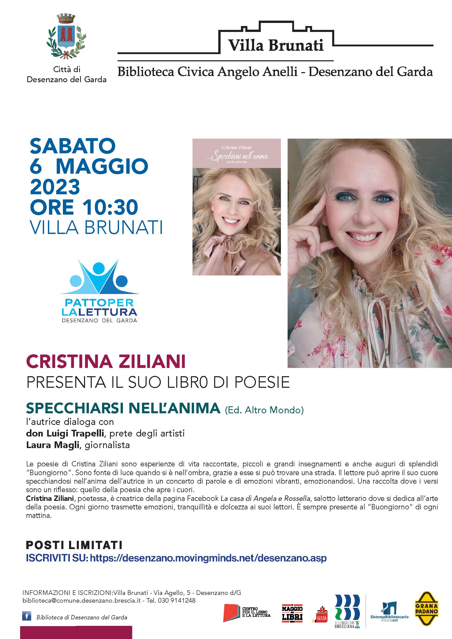 SABATO 6 MAGGIO 2023, ORE 10:30 PRESENTAZIONE DEL LIBRO POESIE CRISTINA ZILIANI SPECCHIARSI NELL’ANIMA (Ed. Altro Mondo) l’autrice dialoga con don Luigi Trapelli, prete degli artisti Laura Magli, giornalista