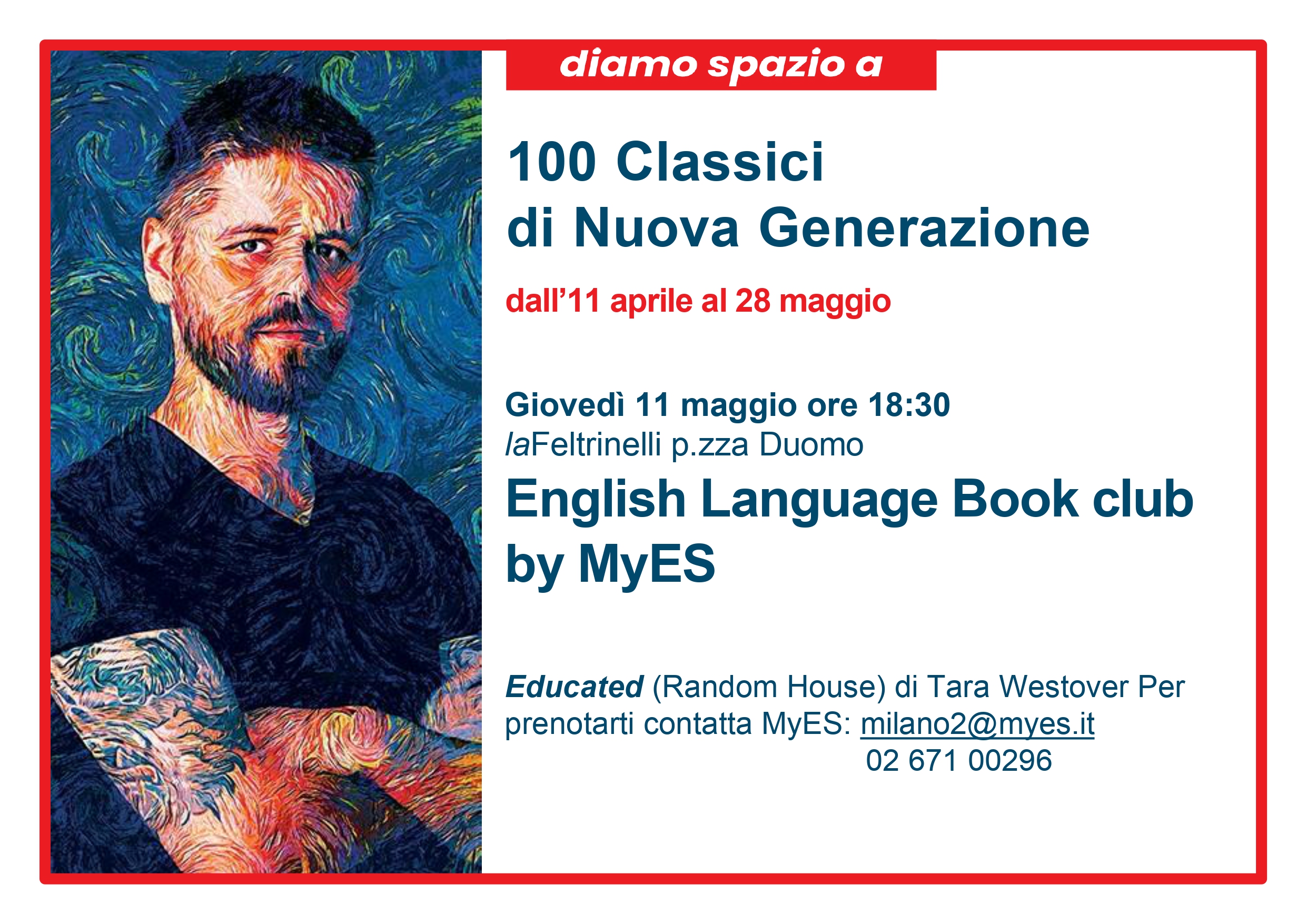 Nell’ambito del progetto “100 CLASSICI DI NUOVA GENERAZIONE” partiamo dalla “classifica” di 100 libri proposti dai librai laFeltrinelli di tutt’Italia, per esplorare insieme al pubblico di lettori quali sono le opere letterarie della nostra epoca che - scommettiamo - sono destinate a diventare “Classici di Nuova Generazione”. Ne parliamo nei nostri nuovi gruppi di lettura. In compagnia dei docenti di My English School si parlerà di Educated (Random House) di Tara Westover. Per prenotarti contatta MyES: milano2@myes.it, tel 02 671 00296.