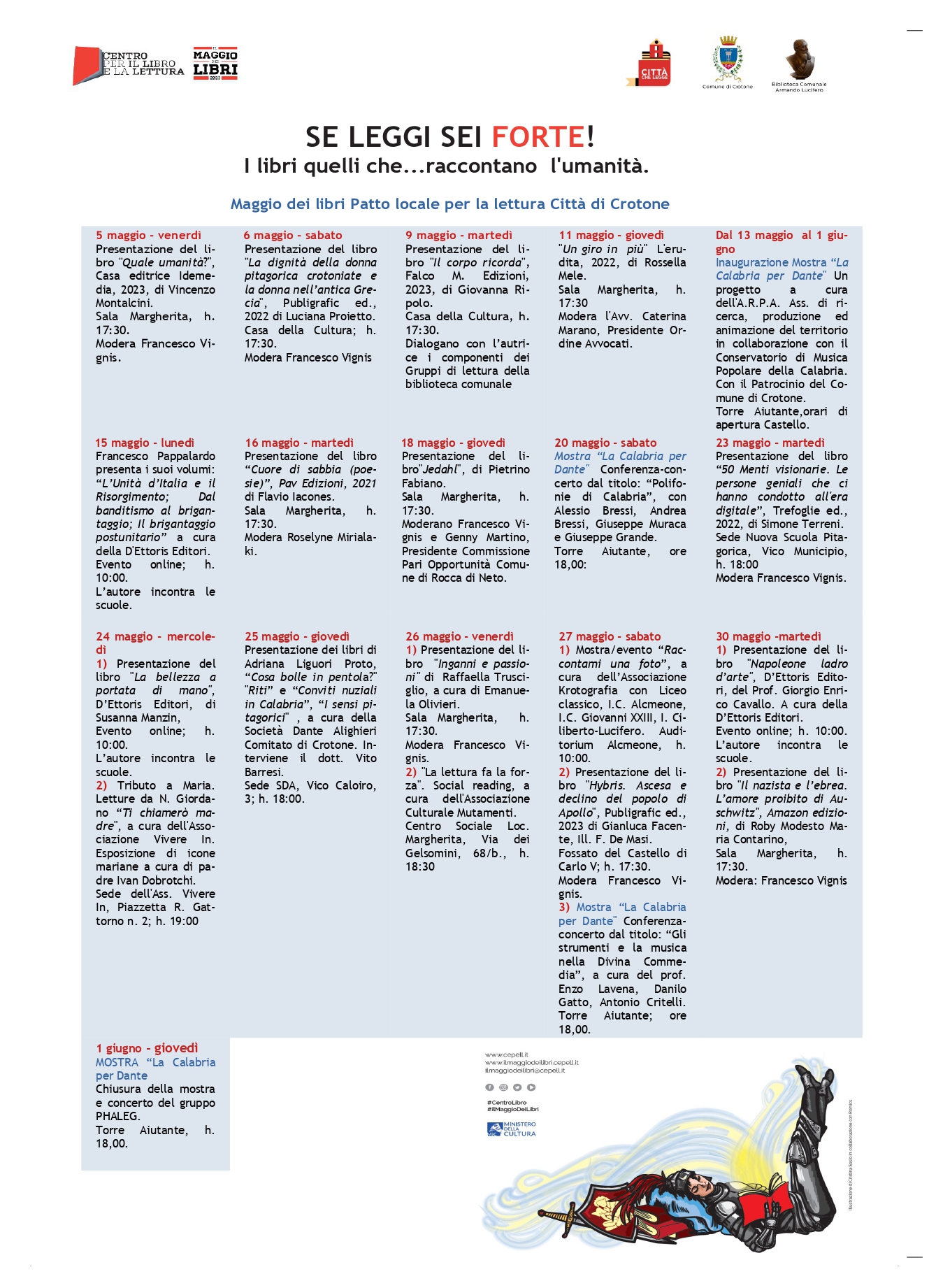 Un maggio ricco di libri anche per il 2023, quello proposto dall'Assessorato alla Cultura, la Biblioteca comunale Armando Lucifero e il Patto locale per la lettura della Città di Crotone. Un calendario di incontri con gli autori, di mostre, di eventi e musica, per parlare di libri, cultura, partenze e approdi, da e per terre lontane.