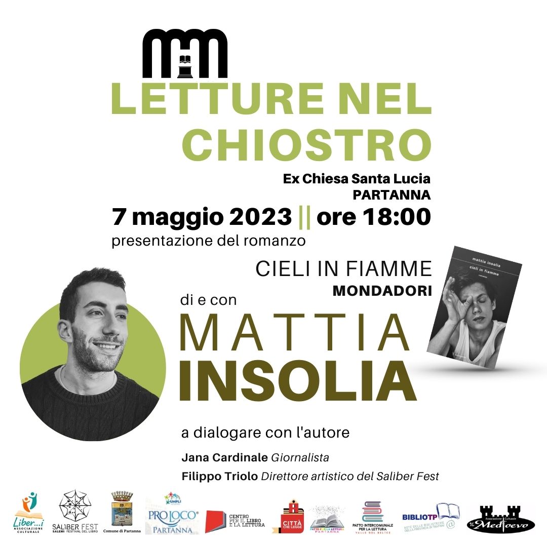 Anteprima della quarta edizione della rassegna "Letture nel chiostro" della città di Partanna. Il 07 maggio 2023 alle ore 18,00 presso i locali dell'ex Chiesa di Santa Lucia, lo scrittore Mattia Insolia presenterà il romanzo "Cieli in fiamme" edito da Mondadori. A dialogare con il giovane autore catanese, la giornalista Jana Cardinale ed il direttore artistico del Salìber fest e di letture nel chiostro, Filippo Triolo.