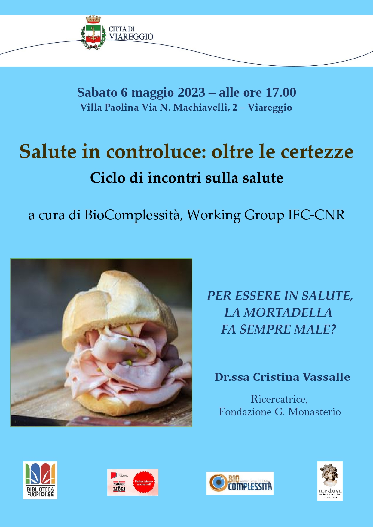 Conferenza "Per essere in salute, la mortadella fa sempre male?" a cura della dott.ssa Cristina Vassalle, ricercatrice presso la Fondazione G. Monasterio. Ognuno di noi necessita di un diverso apporto di sostanze nutritive, fatto che dipende da numerosi fattori, come sesso, età, peso, stato di salute, e stile di vita. Una dieta sana,