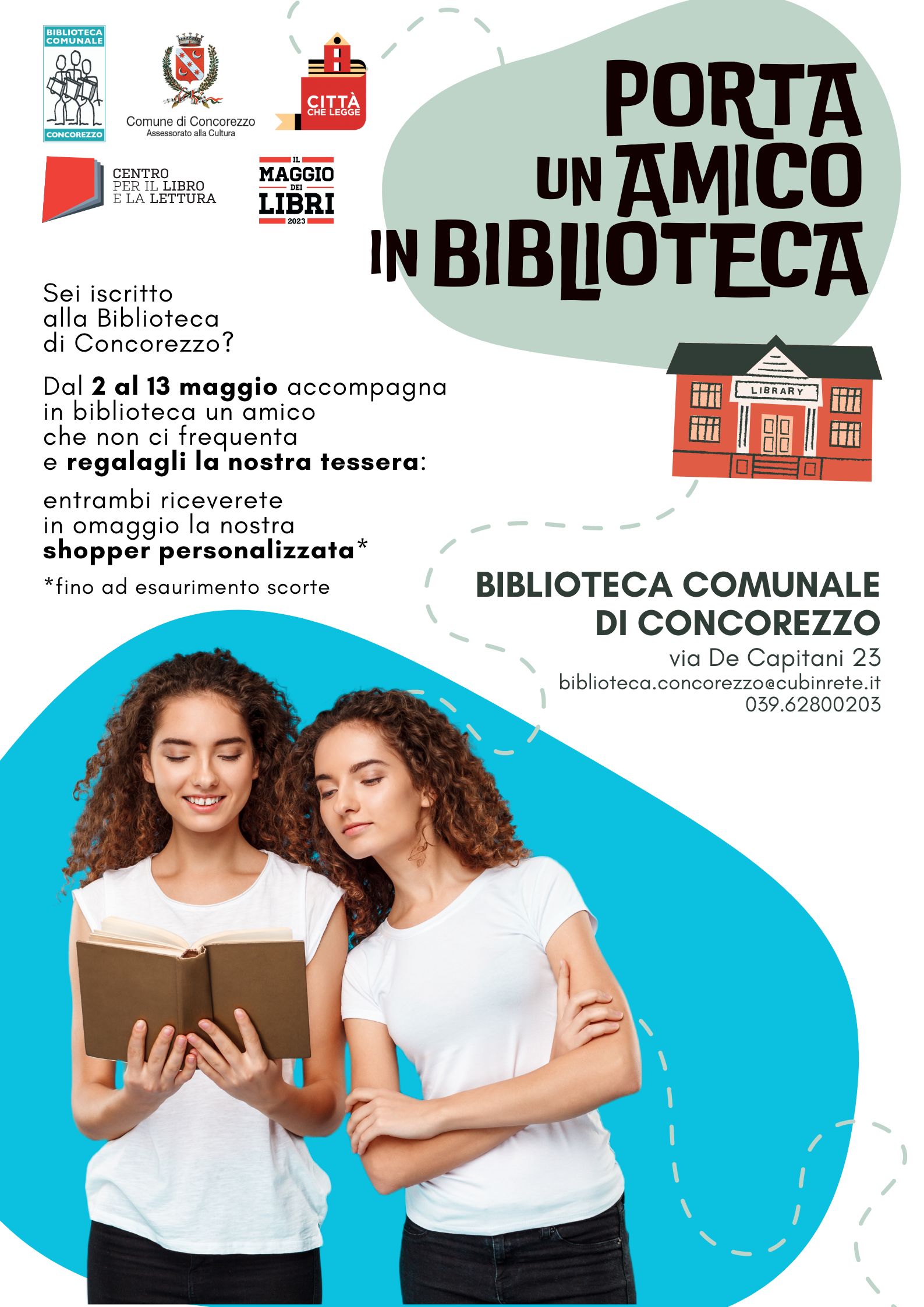 Sei iscritto alla Biblioteca di Concorezzo? Dal 2 al 13 maggio accompagna in biblioteca un amico che non ci frequenta e regalagli la nostra tessera: entrambi riceverete in omaggio la nostra shopper personalizzata* *fino ad esaurimento scorte