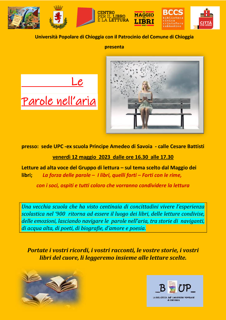 Letture ad alta voce del Gruppo di lettura – sul tema scelto dal Maggio dei libri. La forza delle parole – I libri, quelli forti – Forti con le rime, con i soci, ospiti e tutti coloro che vorranno condividere la lettura. L'evento si svolge nella sede dell'Università Popolare di Chioggia, in una vecchia scuola che ha visto centinaia di concittadini vivere l’esperienza scolastica nel ‘900 e che ritorna ad essere il luogo dei libri, delle letture condivise, delle emozioni, lasciando navigare le parole nell’aria, tra storie di naviganti, di acqua alta, di poeti, di biografie, d’amore, poesia e musica. Leggeremo anche alcuni testi di canzoni e poi insieme ricreeremo l'atmosfera cantandole. Invitiamo inoltre le persone a portare le loro storie, i ricordi, i loro racconti, i libri del cuore e dell'anima che leggeremo assieme.