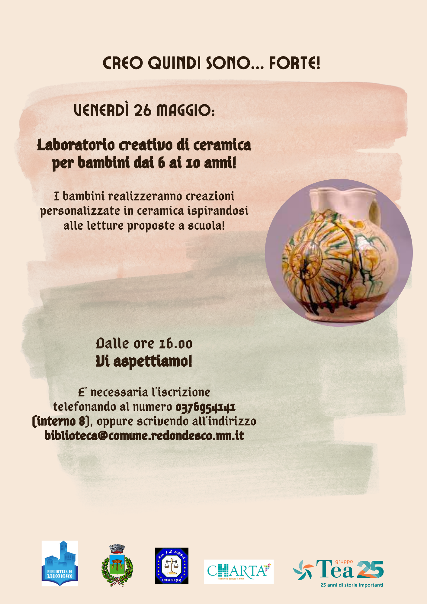 Organizzazione di un laboratorio di ceramica grazie al quale i bambini tra i 6 e i 10 anni potranno esprimere la loro creatività ispirandosi alle storie ascoltate a scuola.