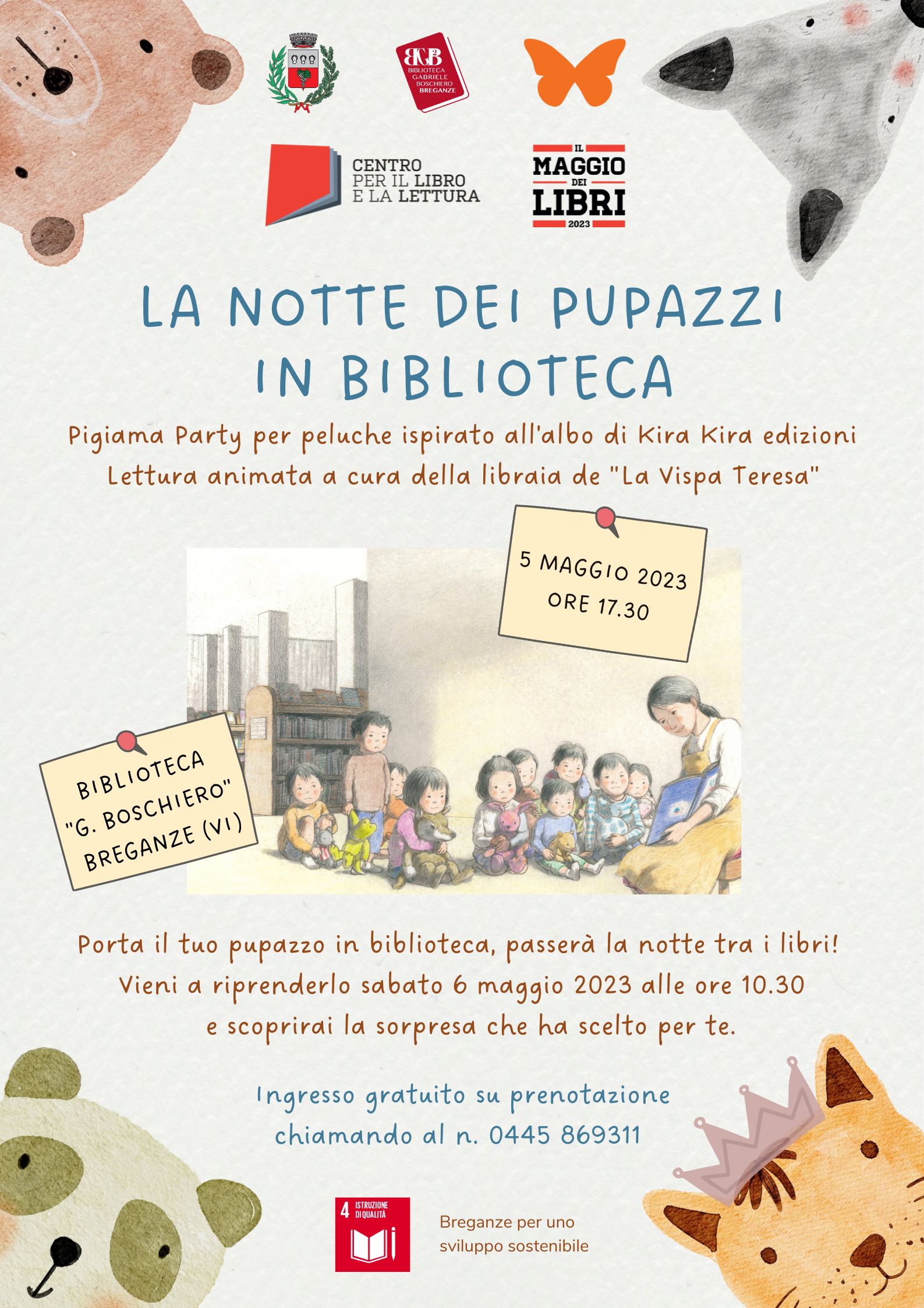 Pigiama party per peluche ispirato all'abo di Kika Kira edizoni. Lettura animata a cura della libraia Teresa della libreria "La Vispa Teresa". Porta il tuo pupazzo in biblioteca, ascoltate la storia assieme e poi lascialo qui da noi: passerà la notte tra i libri! Vieni a riprenderlo sabato 6 maggio alle ore 10.30 e scopri la sorpresa che ha scelto per te.