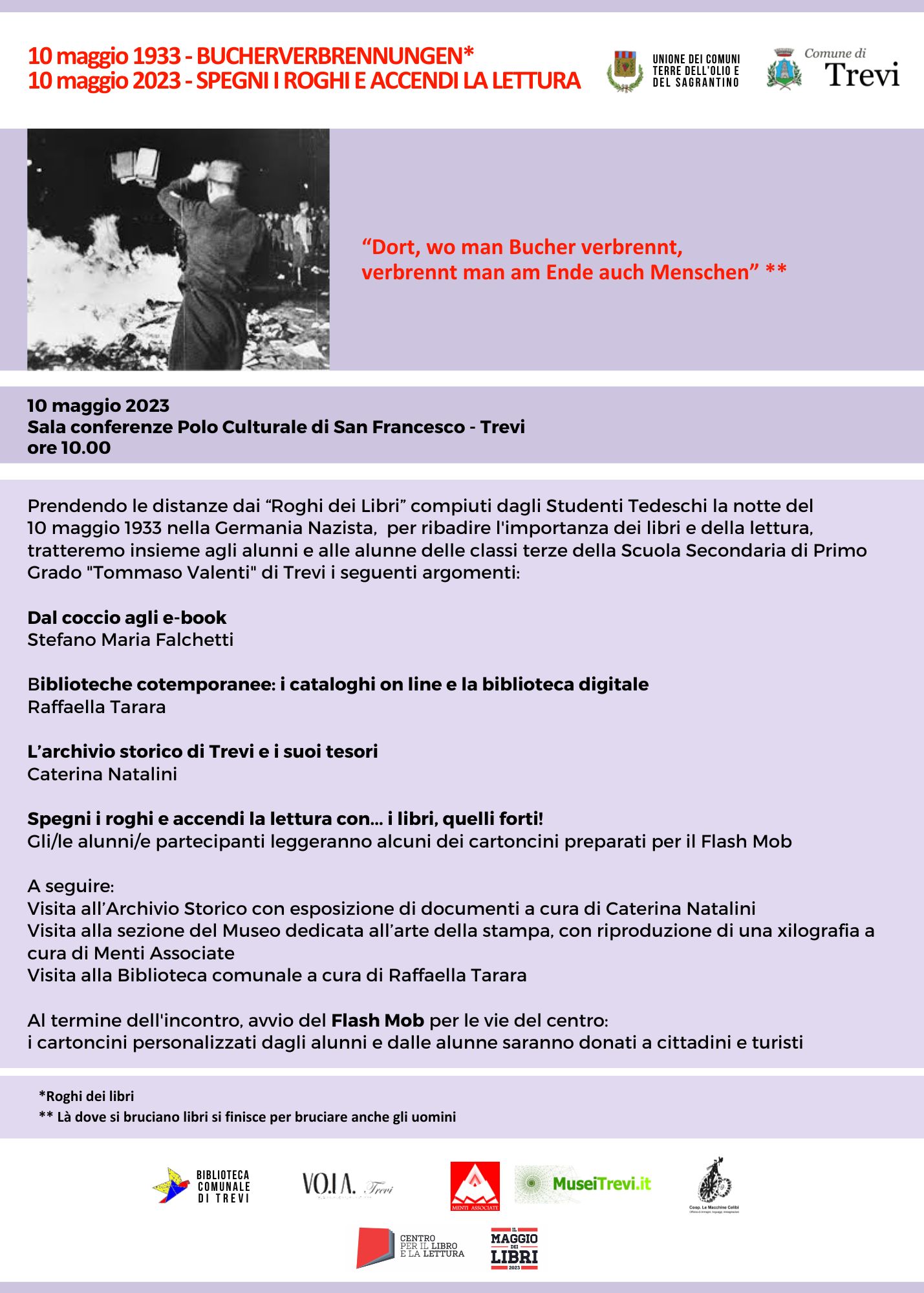 Prendendo le distanze dai “Roghi dei Libri” compiuti dagli Studenti Tedeschi la notte del 10 maggio 1933 nella Germania Nazista, per ribadire l'importanza dei libri e della lettura, tratteremo insieme agli alunni e alle alunne delle classi terze della Scuola Secondaria di Primo Grado "Tommaso Valenti" di Trevi i seguenti argomenti: